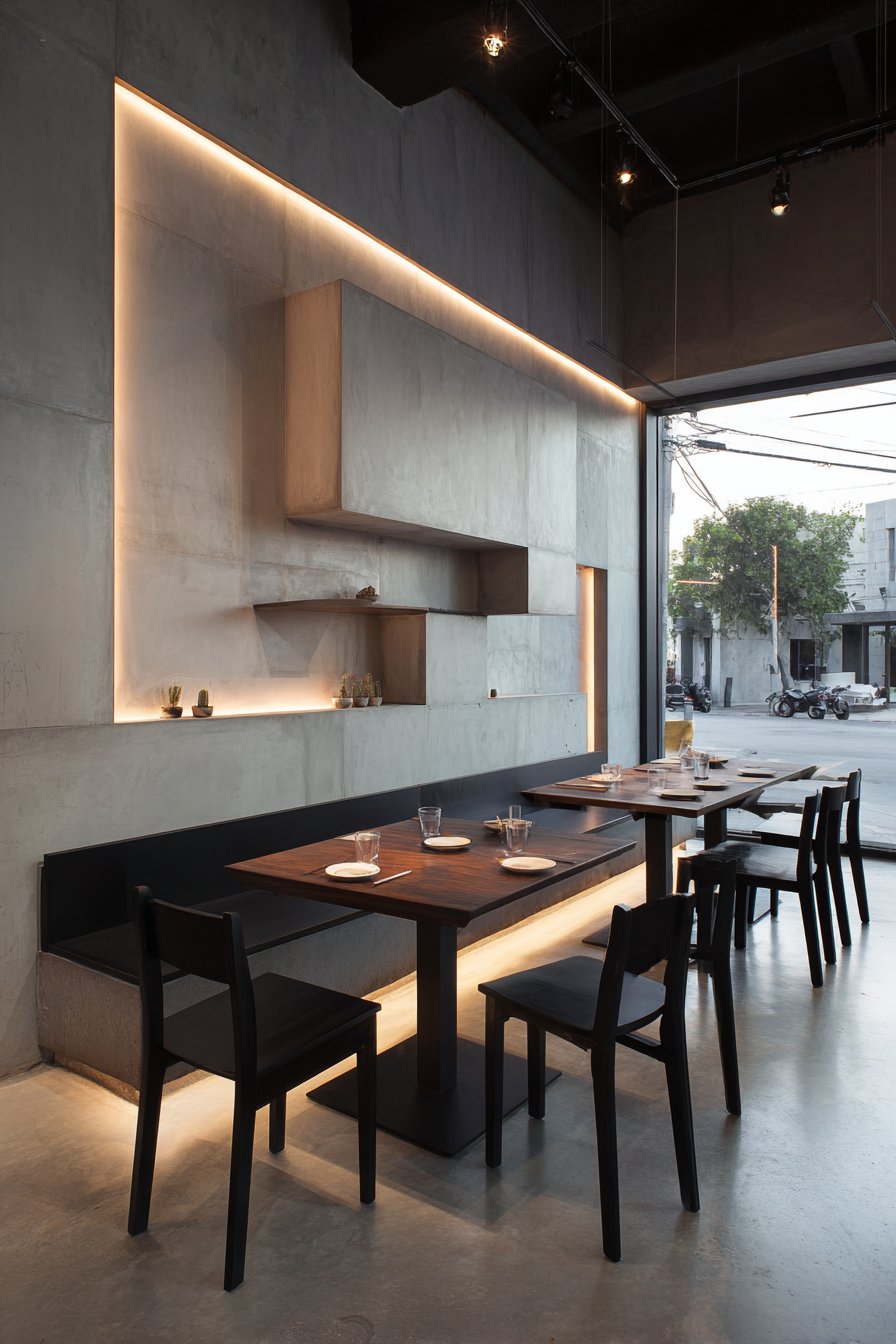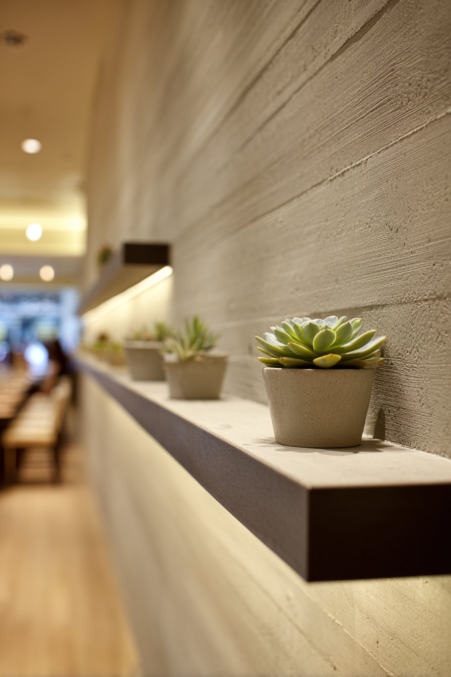 Matching concrete floating shelves extend the material vocabulary while providing functional display space for small succulent arrangements or minimalist ceramic vessels that complement rather than compete with the wall’s austere beauty. This restaurant wall design idea works exceptionally well in contemporary spaces featuring clean-lined furniture, neutral color palettes, and cuisine presentations that emphasize artful plating and ingredient purity. The concrete’s inherent durability also offers practical advantages in high-traffic restaurant environments, resisting damage from chair backs, server carts, and general wear that might mark softer wall treatments.