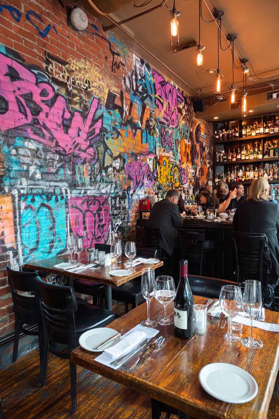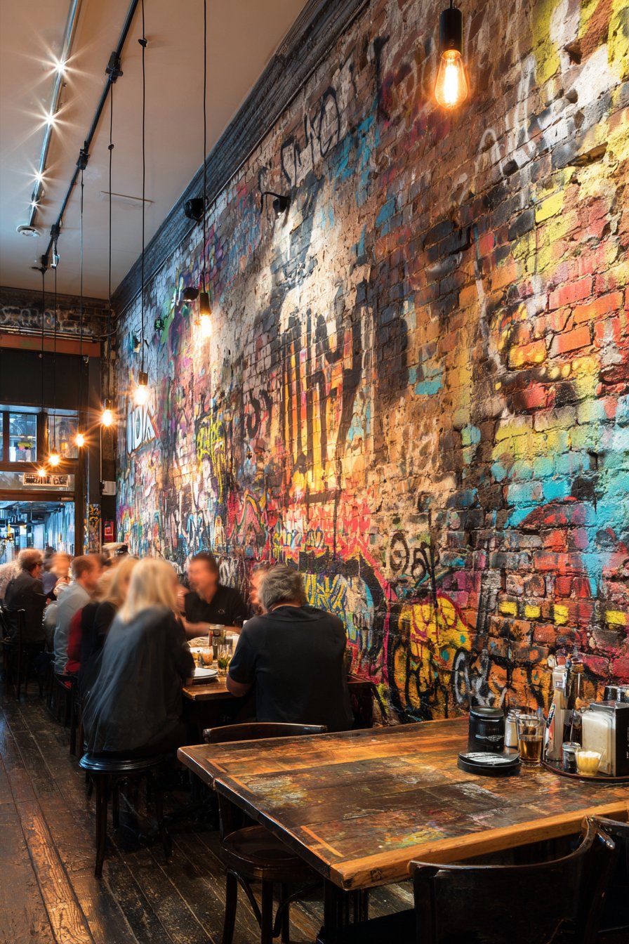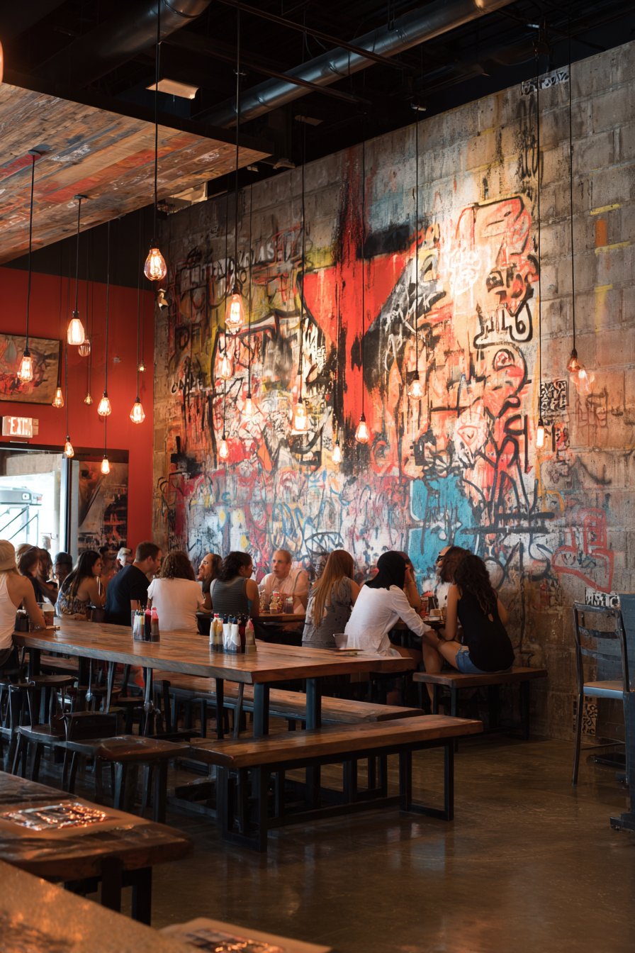 An eclectic mural painted directly on exposed brick brings vibrant energy and urban authenticity to restaurant spaces, particularly those targeting younger demographics or locations in arts districts and culturally dynamic neighborhoods. The artistic wall treatment depicting urban street scenes with layered graffiti-style artwork creates visual complexity and narrative depth that rewards repeated viewing. Spanning the full height of a double-story dining space, the mural becomes an immersive environmental artwork that transforms the dining experience into something more akin to visiting an art gallery where exceptional food happens to be served.