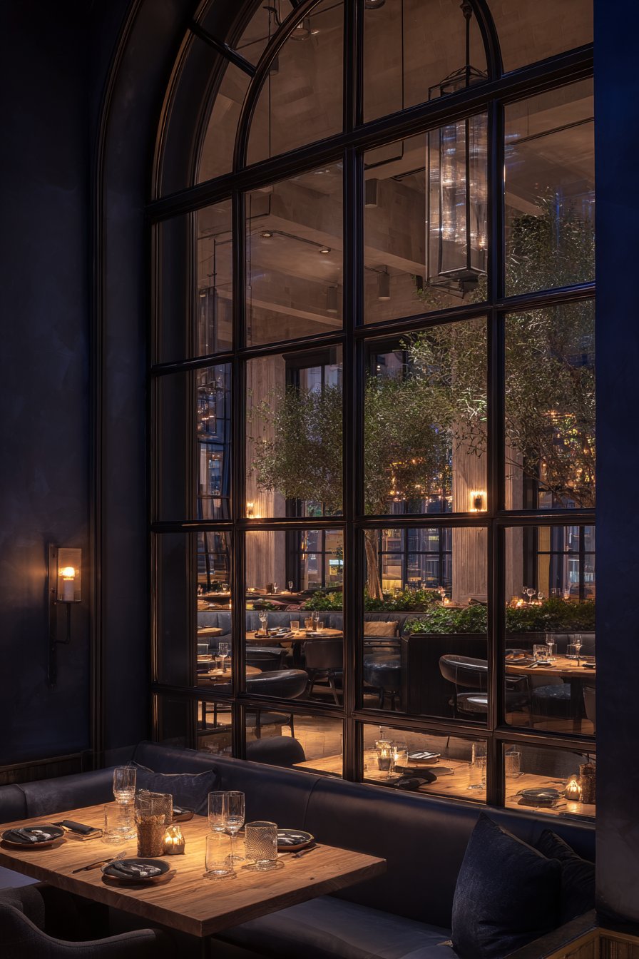 A sophisticated mirror panel installation featuring antiqued bronze frames arranged in a precise grid pattern delivers both functional and aesthetic value in restaurant design. The mirrors create crucial visual depth in narrow dining rooms where physical expansion is impossible, effectively doubling the perceived width of the space while reflecting candlelight from tables and ambient pendant fixtures to amplify overall illumination. The antiqued finish on both mirrors and frames introduces subtle texture and vintage character that prevents the reflective surfaces from reading as stark or coldly modern.