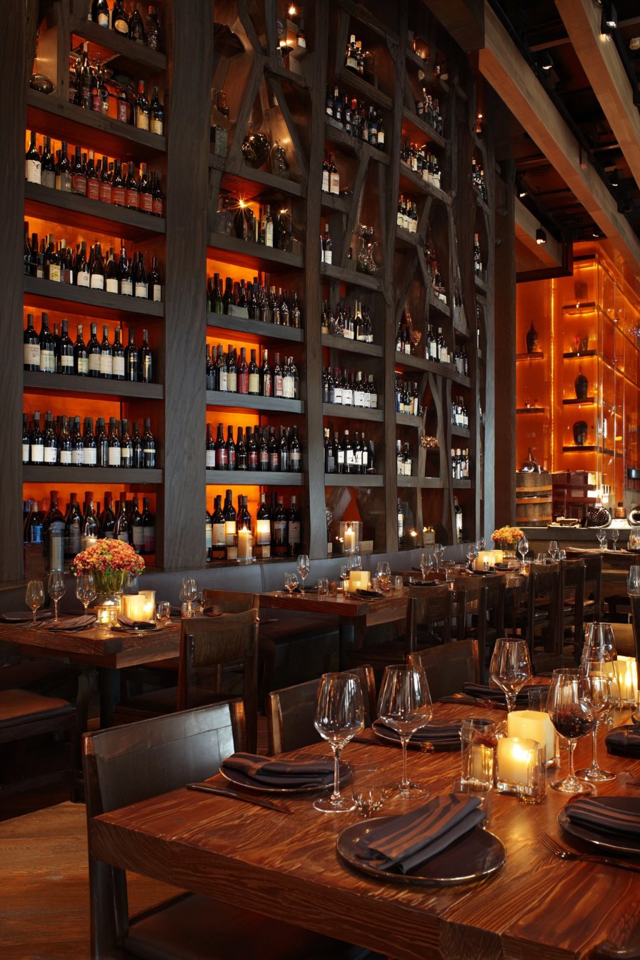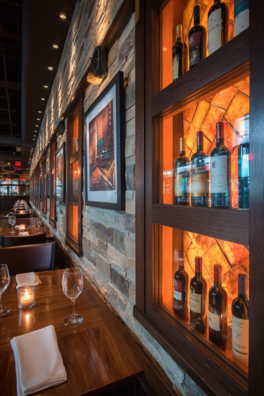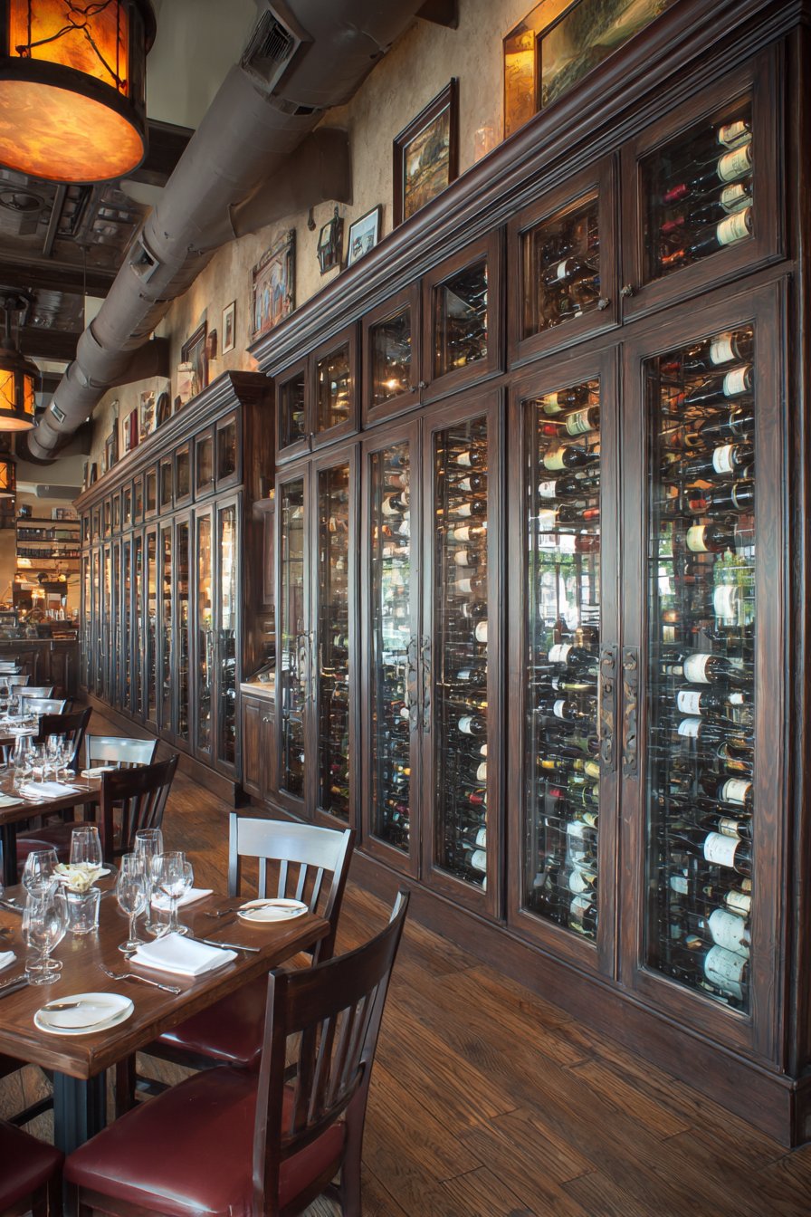 Wide-angle interior design photography captures the installation’s impressive scale while including intimate table settings in the foreground, demonstrating how the restaurant wall design idea integrates with the overall dining environment. The wine wall works particularly well in steakhouses, Italian restaurants, and other establishments where wine service represents significant revenue. From a practical standpoint, the display also facilitates staff training, as servers can easily reference the collection when making recommendations, and wine inventory management becomes simplified through visible organization.