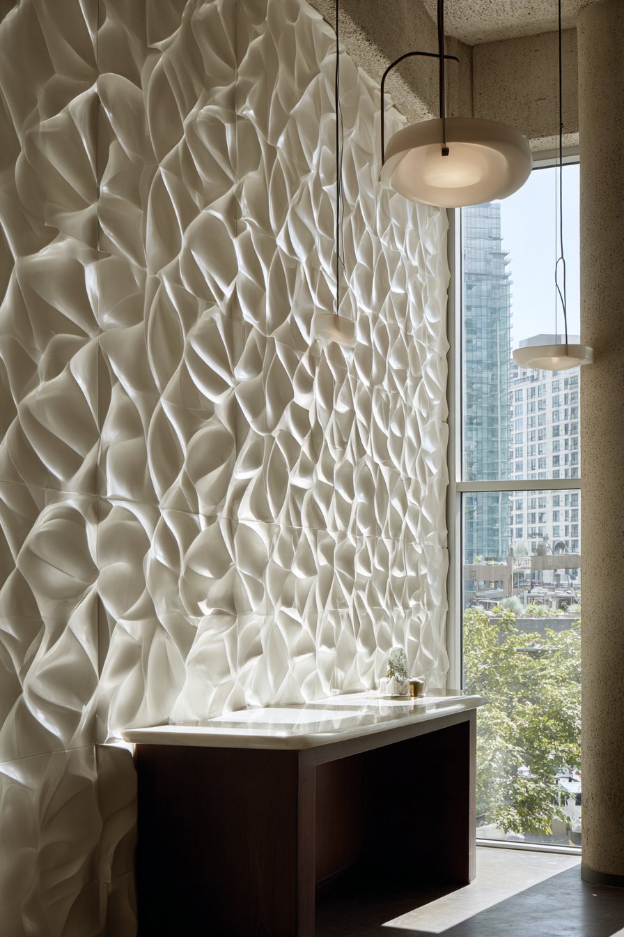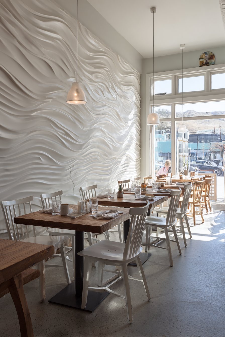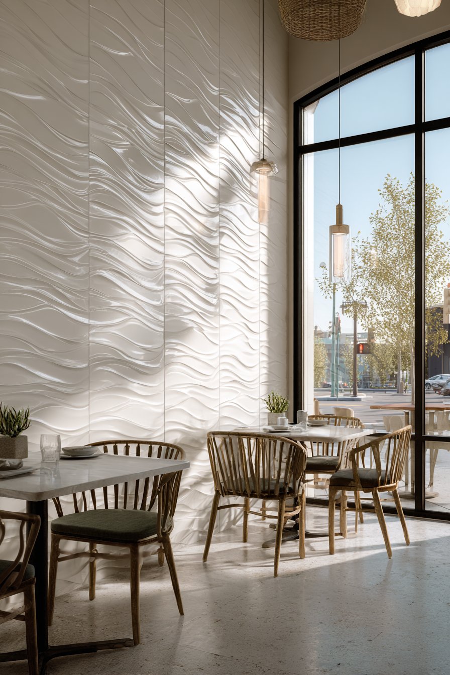 A textured three-dimensional tile installation in matte white ceramic brings sculptural artistry to restaurant walls through wave-like undulations that catch and reflect light dynamically throughout the day. The dimensional tiles create constantly shifting shadow patterns as natural light angles change, providing visual interest that evolves from breakfast through dinner service. This subtle animation maintains guest engagement during extended dining periods while supporting mindful, present-moment awareness through its meditative quality.