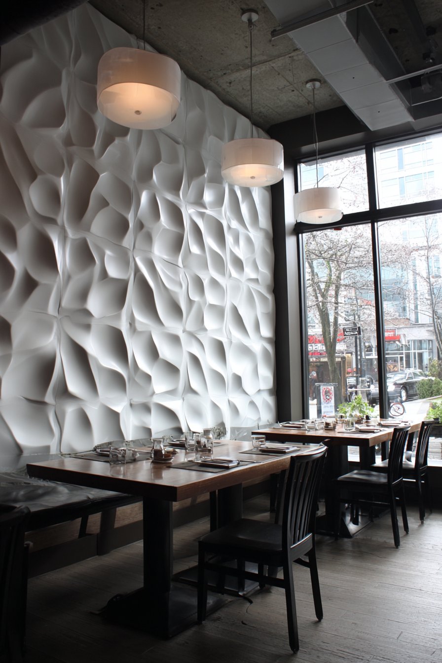 The sculptural tiles covering the main dining room wall require no additional decoration or artwork, as the surface itself provides sufficient visual complexity and aesthetic interest. Simple modern light fixtures in brushed nickel complement the minimalist aesthetic without competing for attention, allowing the textured wall to remain the focal point. The monochromatic white palette creates clean, fresh impressions particularly suited to coastal restaurants, modern cafés, or health-focused establishments where cleanliness and purity are brand values.