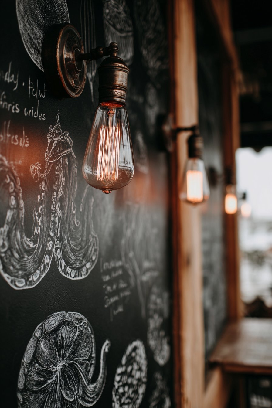Vintage-style wall sconces with exposed filament bulbs flank the chalkboard, providing necessary illumination for reading while contributing to the overall rustic-industrial aesthetic. The warm light from Edison bulbs creates inviting glow without creating glare on the chalkboard surface, ensuring text remains clearly legible from all seating positions. Professional lettering—whether executed by skilled staff or commissioned from professional sign painters—elevates the chalkboard from utilitarian communication tool to artistic feature that demonstrates craftsmanship and attention to detail.