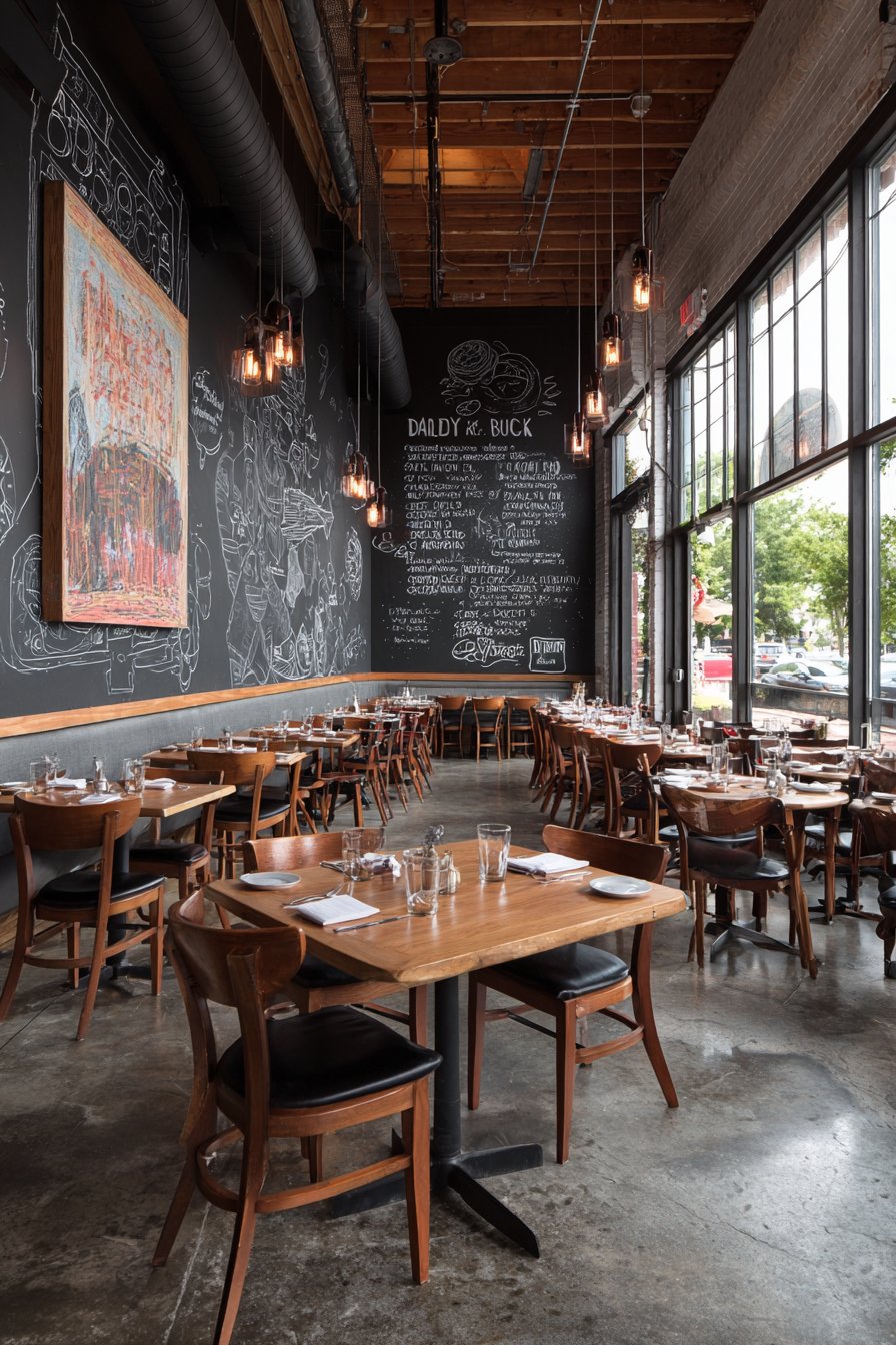 Interior design photography showing the casual bistro atmosphere must manage exposure carefully to prevent glare on the chalkboard surface while highlighting chalk typography details and artistic embellishments. This restaurant wall design idea works exceptionally well in cafés, farm-to-table restaurants with frequently changing menus, neighborhood bistros, and anywhere authenticity and flexibility are valued over formal polish. The chalkboard can be updated daily, seasonally, or as needed, providing design versatility that static wall treatments cannot match.