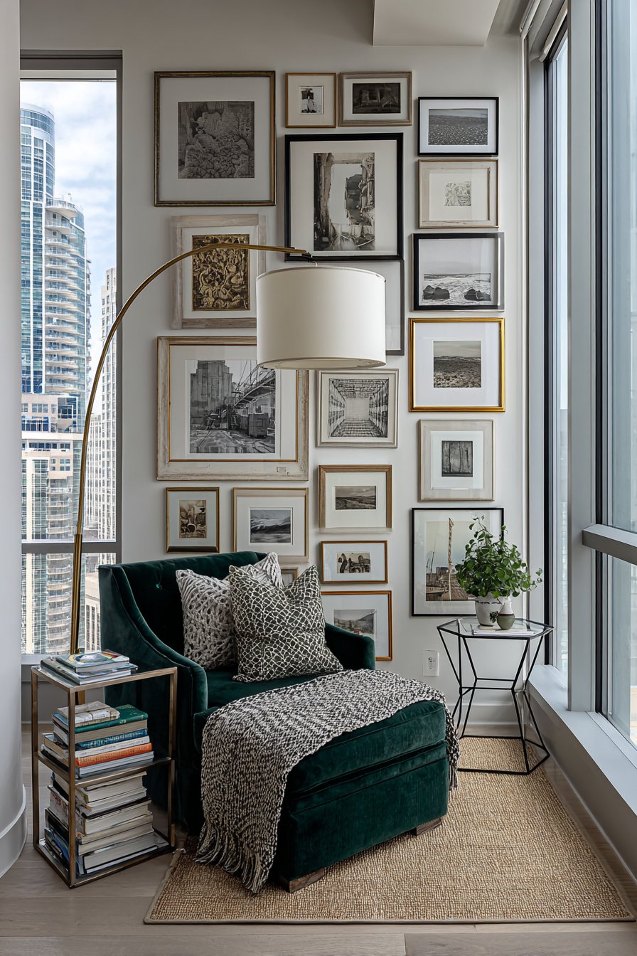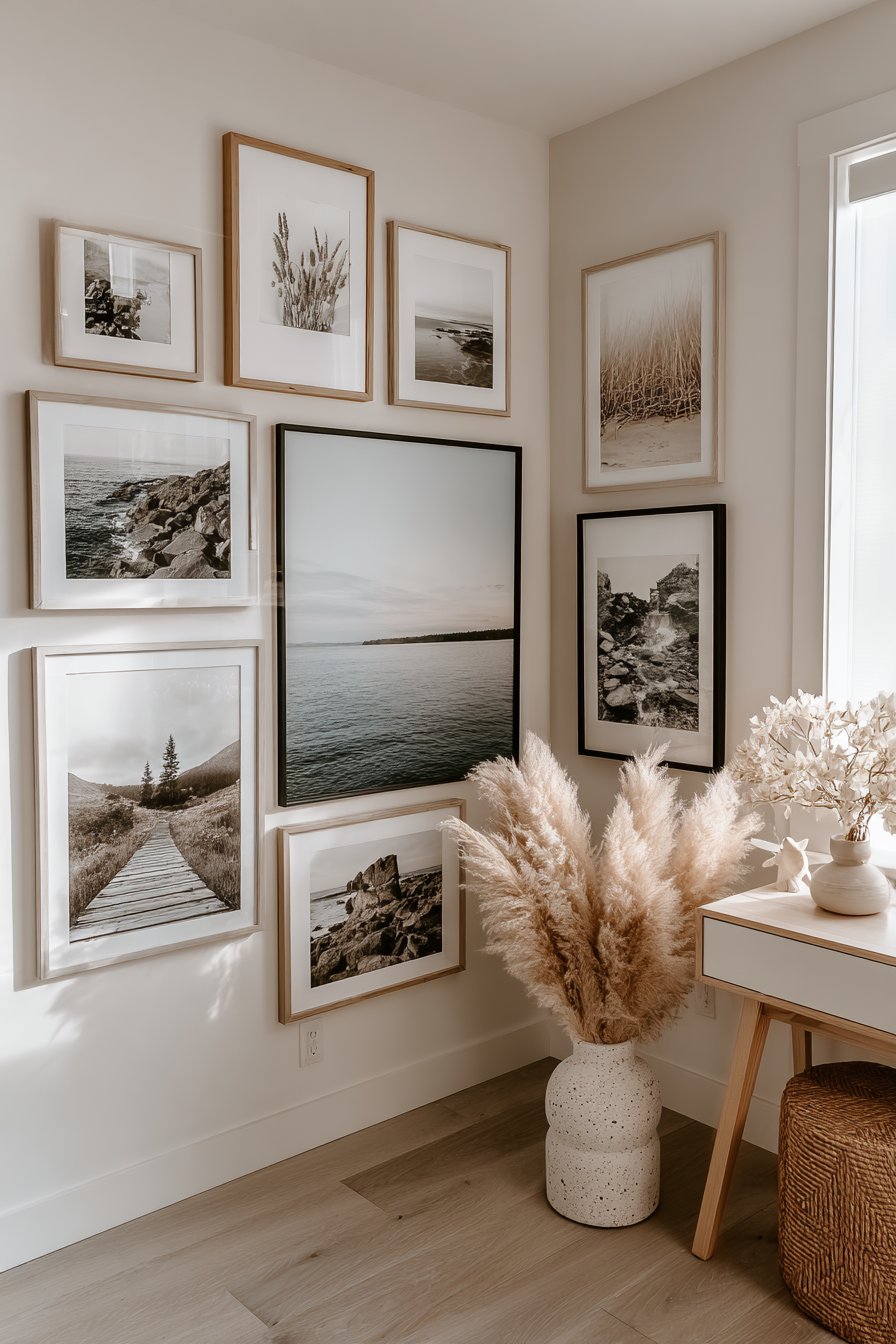 A gallery wall corner featuring room corner decor ideas transforms blank walls into a personal museum that reflects your interests, travels, and aesthetic sensibilities. This artful arrangement wraps around both walls with framed prints and photographs in mixed frame styles—black for contemporary pieces, natural wood for landscapes or vintage photographs, and white for minimalist prints. The frames vary in size from intimate 5×7 portraits to substantial 16×20 statement pieces, arranged in an organic salon-style layout that appears effortless yet is actually carefully planned to balance visual weight across the corner.