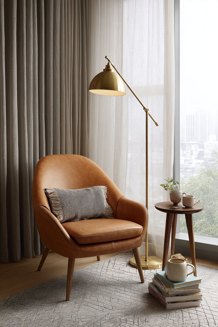The supporting elements elevate this corner from simple seating to a complete experience. A tall brass floor lamp with an adjustable arm provides essential task lighting, allowing you to read comfortably at any time of day. The lamp’s metallic finish adds a touch of sophistication while its adjustable nature ensures ergonomic lighting for extended reading sessions. A small round side table in walnut wood holds the essentials—a carefully curated stack of design books, a ceramic mug for your morning coffee or evening tea, and perhaps a pair of reading glasses within easy reach.