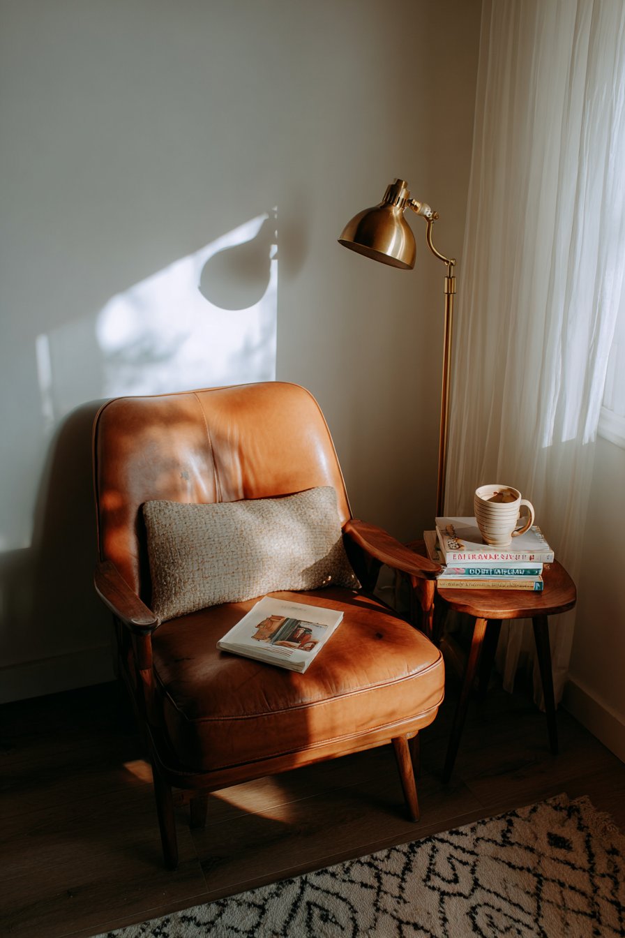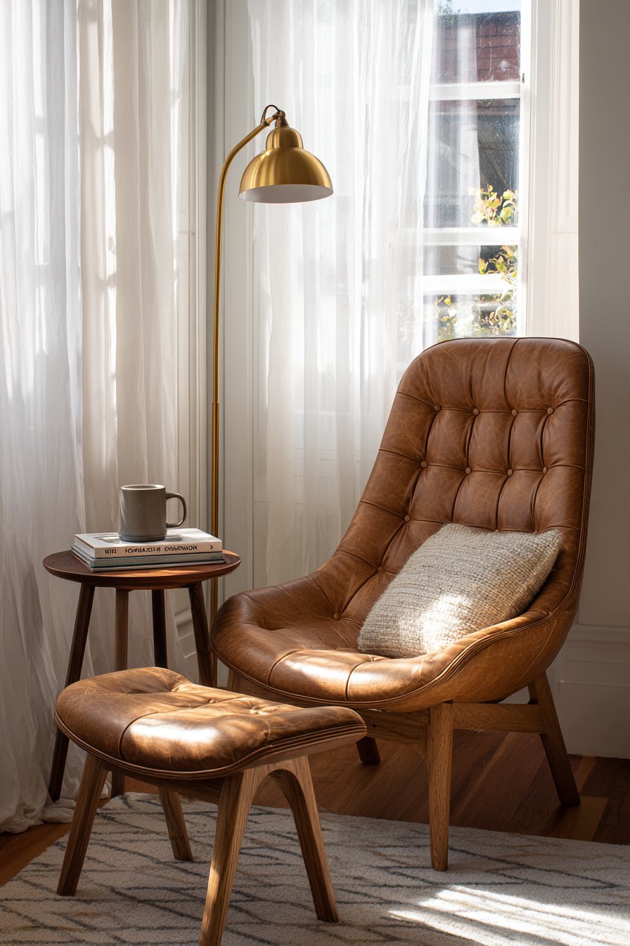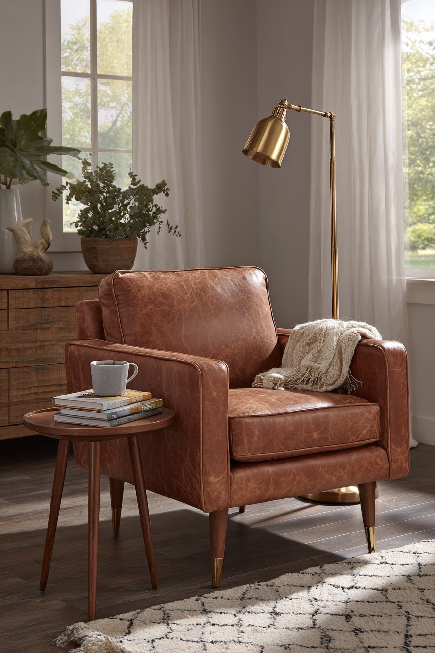 A well-designed reading corner featuring room corner decor ideas represents one of the most beloved and accessible transformations for any home. Picture a mid-century modern accent chair upholstered in warm cognac leather, positioned at a thoughtful 45-degree angle that invites you to curl up with a good book. The leather develops a beautiful patina over time, its rich caramel tones catching and reflecting natural light in ways that synthetic materials simply cannot replicate. This positioning creates an intimate enclave while maintaining visual connection to the broader room.
