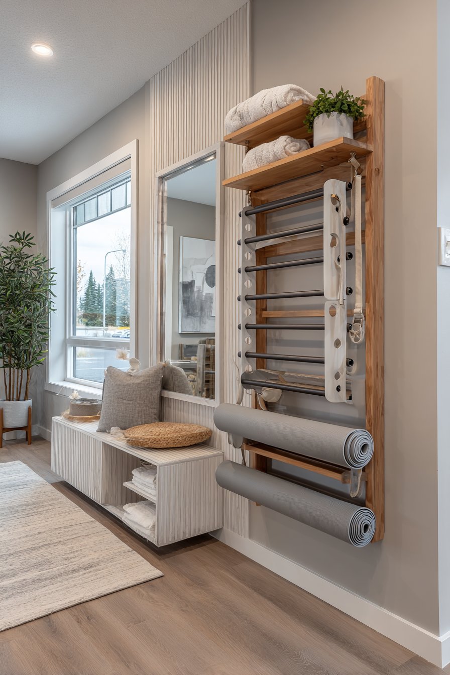 A corner workout space featuring room corner decor ideas demonstrates how fitness facilities can be integrated seamlessly into living spaces without requiring dedicated rooms. The wall-mounted fold-down yoga mat holder and resistance band storage in brushed nickel finish keeps equipment organized and accessible while maintaining a clean appearance when not in use. The fold-down feature is particularly clever—mats can be stored flat against the wall, preserving floor space for other activities between workout sessions.