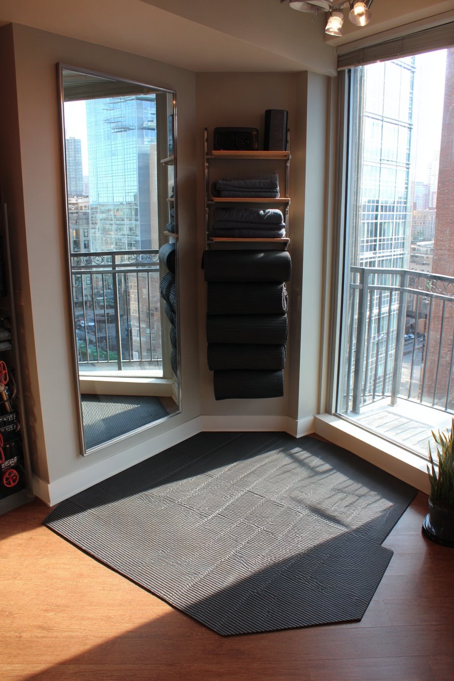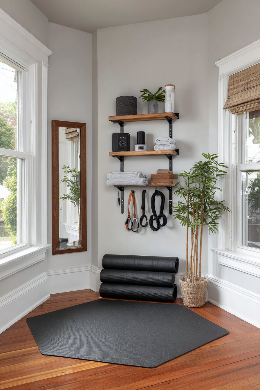 A full-length mirror spans one corner wall, serving the practical purpose of checking form during exercises while creating the visual illusion of expanded space—a valuable effect in compact corner installations. The mirror placement in the corner maximizes its usefulness, allowing you to see yourself from multiple angles without requiring multiple mirrors. A small bamboo shelf holds neatly rolled towels, keeping them fresh and accessible, along with a wireless speaker for motivating music or guided workout audio.
