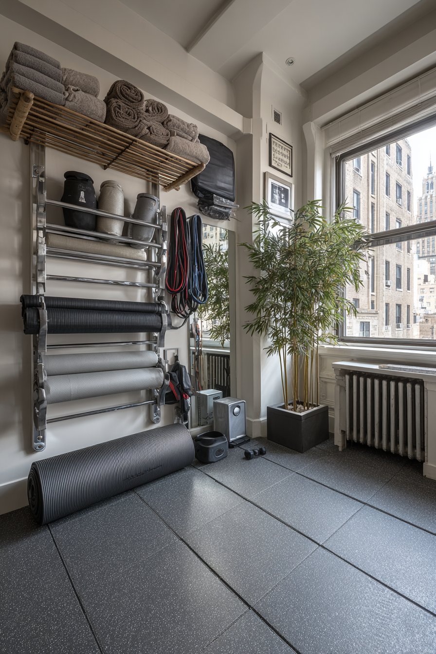 A potted bamboo plant adds a natural element that purifies air and brings calming energy to what might otherwise feel purely utilitarian. Rubber gym flooring in charcoal grey defines the corner workout zone, protecting the floor beneath from dropped weights or high-impact exercises while providing cushioning that reduces joint stress and noise transmission to neighbors below.