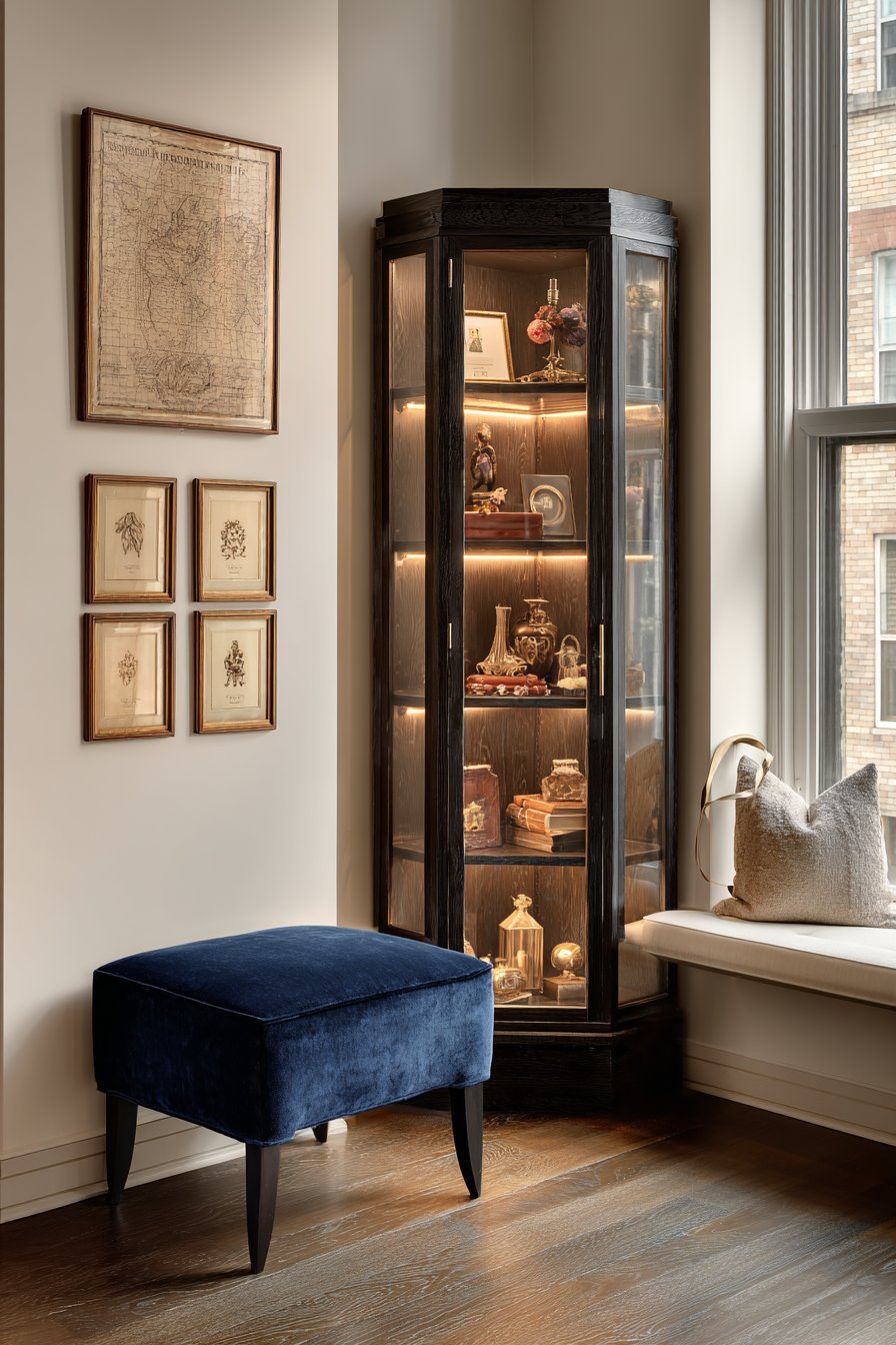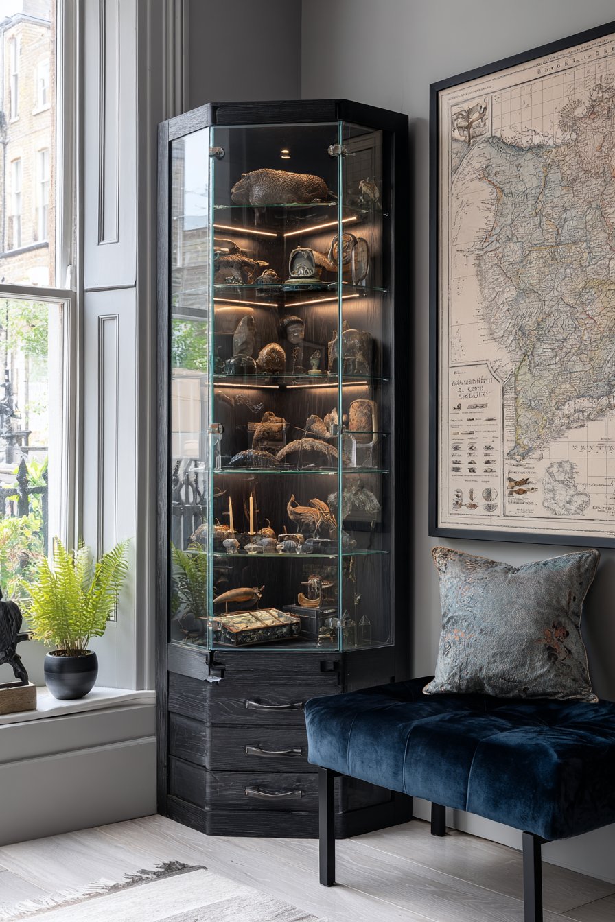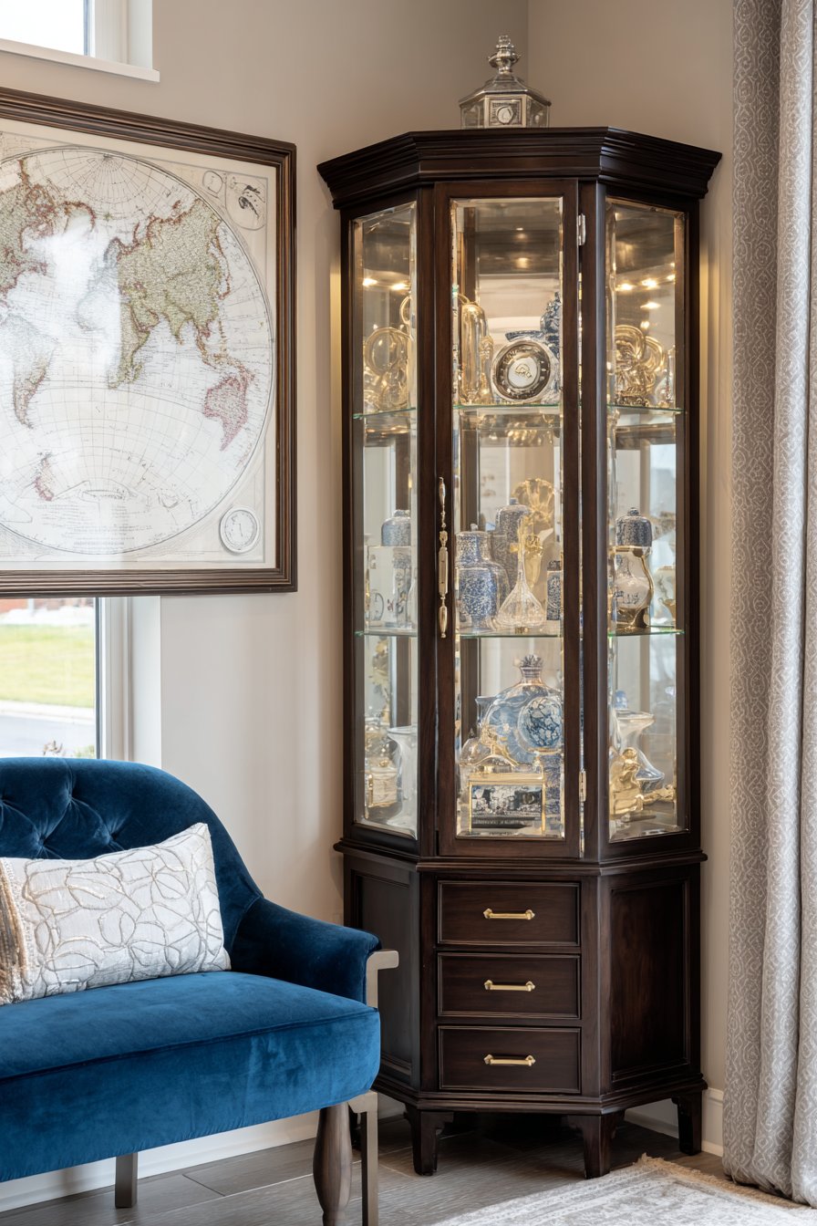 Adjacent to the cabinet, a complementary framed vintage map hangs on the wall, perhaps depicting travels that relate to the collected items or simply adding another layer of visual interest and historical connection. A small upholstered bench in navy velvet sits nearby, providing comfortable seating for contemplating the displayed items or for guests to rest while viewing your collection during home tours.