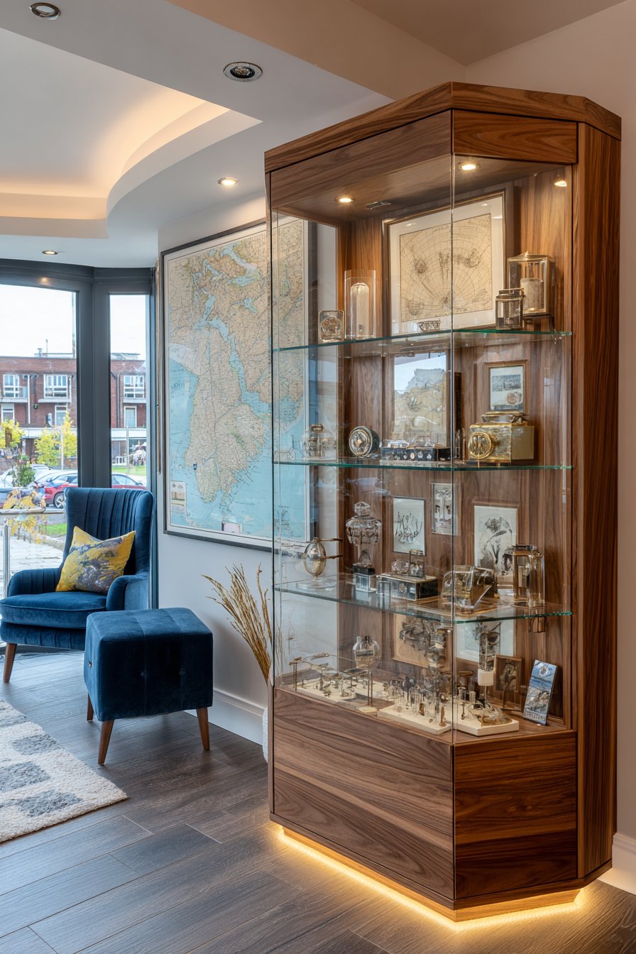 Interior cabinet lighting with warm LED strips illuminates each shelf from above or below, casting gentle light on displayed items without the heat and energy consumption of traditional bulbs. This lighting serves both practical and aesthetic purposes: it makes items visible even in dimly lit rooms, and it adds drama and importance to the collection by creating a gallery-like presentation. The warm color temperature (2700-3000K) enhances the appearance of wood, ceramics, and metals without the harsh quality of cool white light.