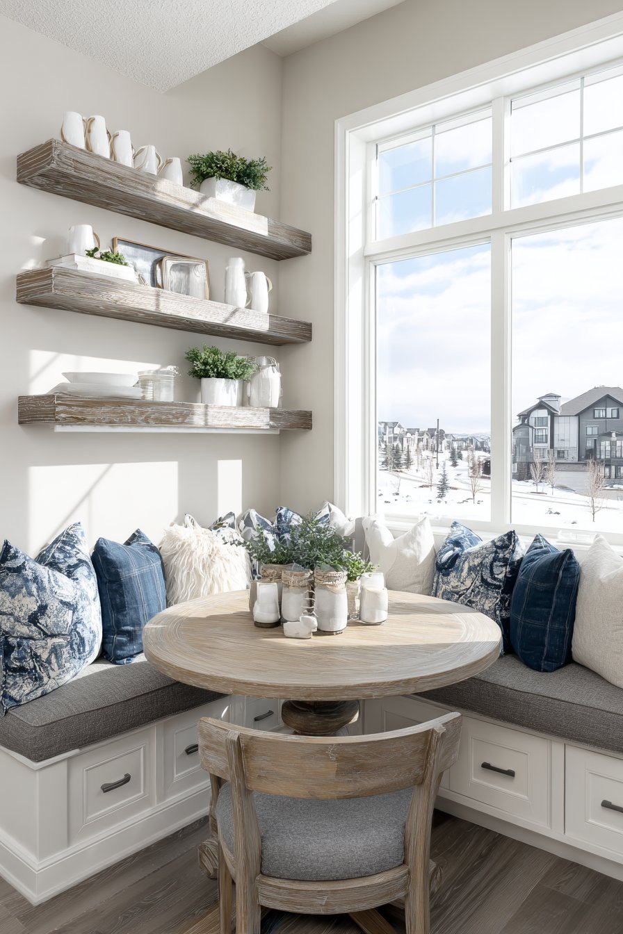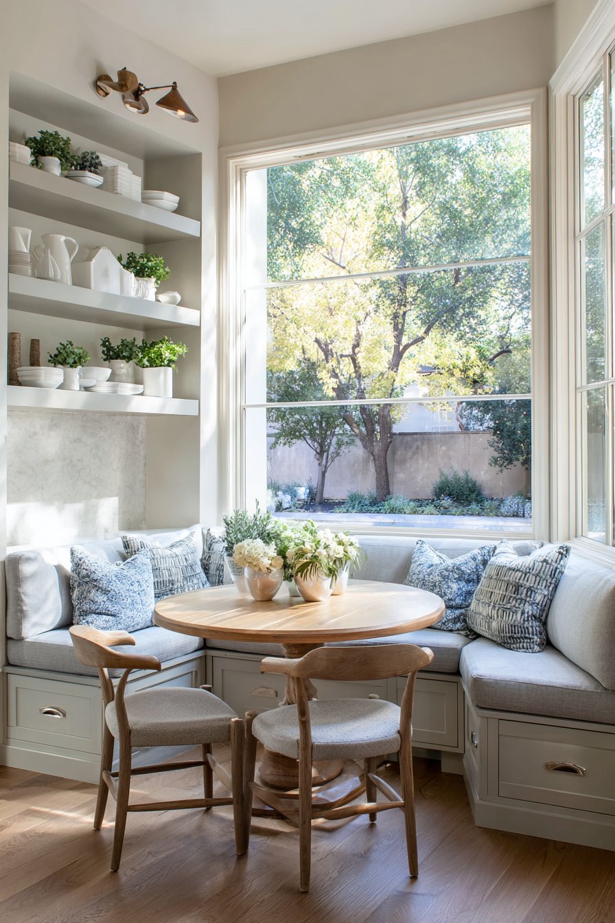 A corner breakfast nook implementing room corner decor ideas creates an intimate dining space that encourages lingering over morning coffee and unhurried conversations. The L-shaped built-in bench featuring storage drawers underneath upholstered in grey linen maximizes seating capacity while the hidden storage addresses the perpetual challenge of small-space living. The linen upholstery brings softness and comfort while remaining durable enough for daily family use, and its neutral grey tone provides a sophisticated backdrop for changing seasonal decorations.