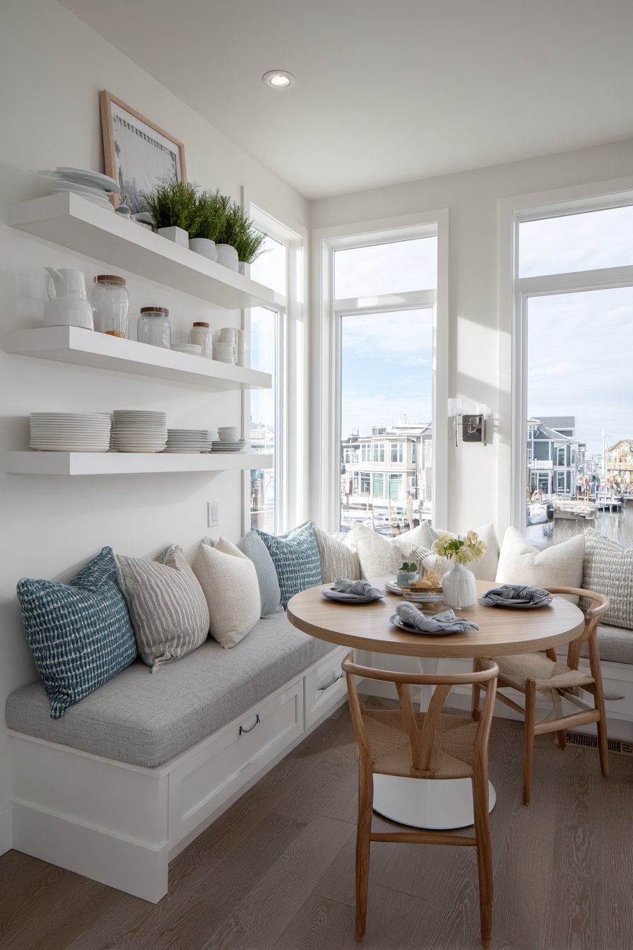 Floating shelves above display white ceramic dishware and potted herbs—perhaps basil, rosemary, and thyme in small terracotta pots. This combination serves both aesthetics and function: the white dishes create clean visual appeal while the fresh herbs provide culinary ingredients literally within arm’s reach during meal preparation. Large windows on both corner walls flood the space with natural morning light, making it the ideal spot for beginning the day.