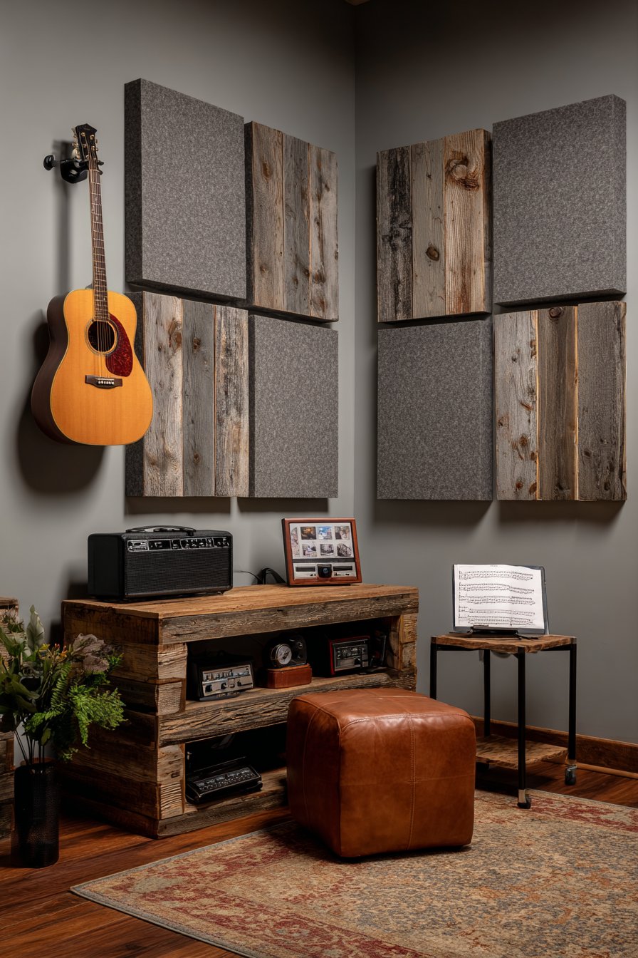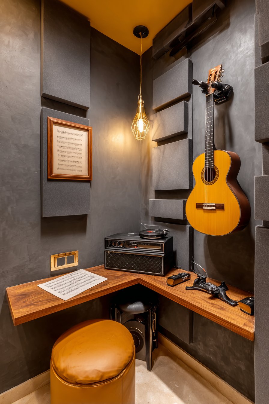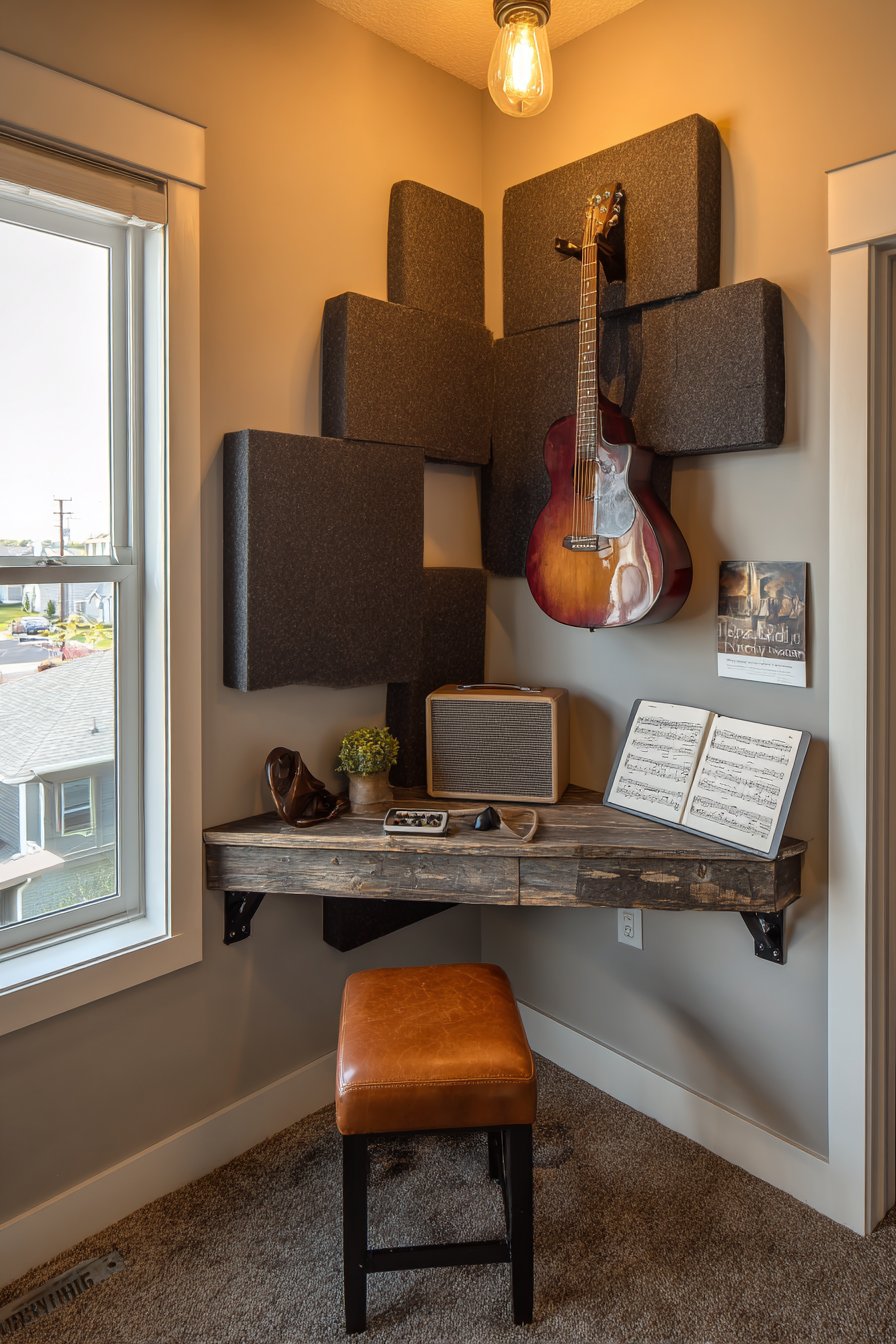 A small amplifier sits on a compact corner shelf constructed from reclaimed wood, its rustic character adding warmth and personality while the corner placement keeps it out of main traffic patterns. Soundproofing foam panels in charcoal grey arrange artfully on corner walls, serving dual purposes as both functional acoustic treatment and intentional design elements. When arranged in patterns rather than uniform grids, these panels become architectural features rather than purely utilitarian additions.