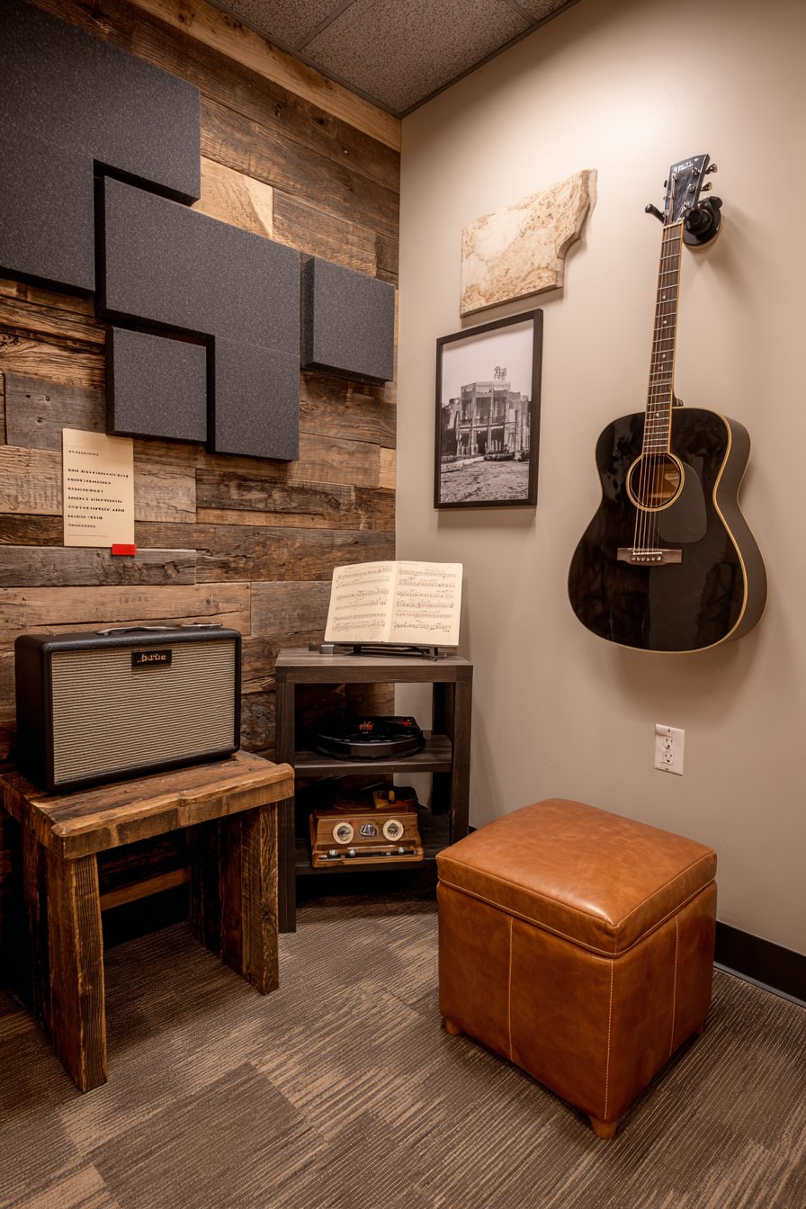 A corner music area showcasing room corner decor ideas provides dedicated space for musical expression while thoughtfully addressing acoustic considerations and equipment storage. An acoustic guitar displayed on a wall-mounted hanger in matte black finish keeps the instrument safely stored while maintaining easy accessibility for spontaneous practice sessions. The wall-mounting also turns the guitar into sculptural art, celebrating its beautiful curves and craftsmanship when not being played.