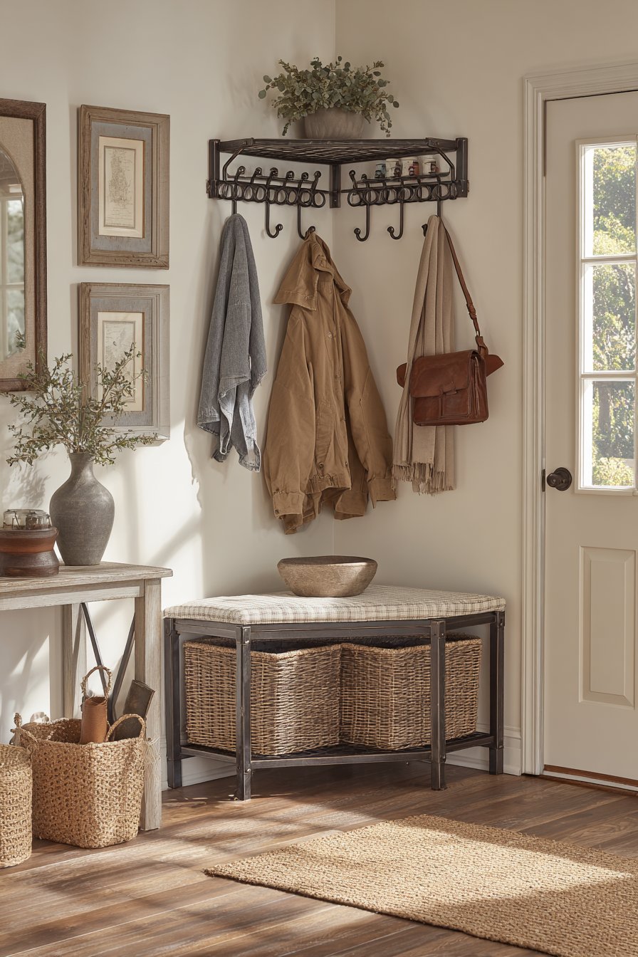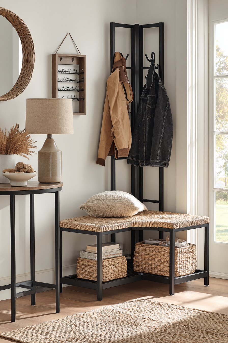 A triangular corner bench with woven rattan seat and lower storage basket provides functional seating for putting on or removing shoes while the basket below corrals shoes, winter accessories, or pet walking supplies. The rattan weaving adds organic texture and visual interest while allowing air circulation that helps prevent odor buildup from stored shoes. Wall-mounted mail organizer and key hooks in matching metal finish keep daily essentials accessible and visible, preventing the frustrating “where are my keys?” searches that delay departures.