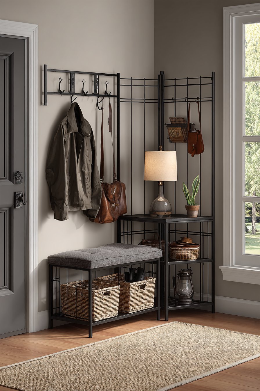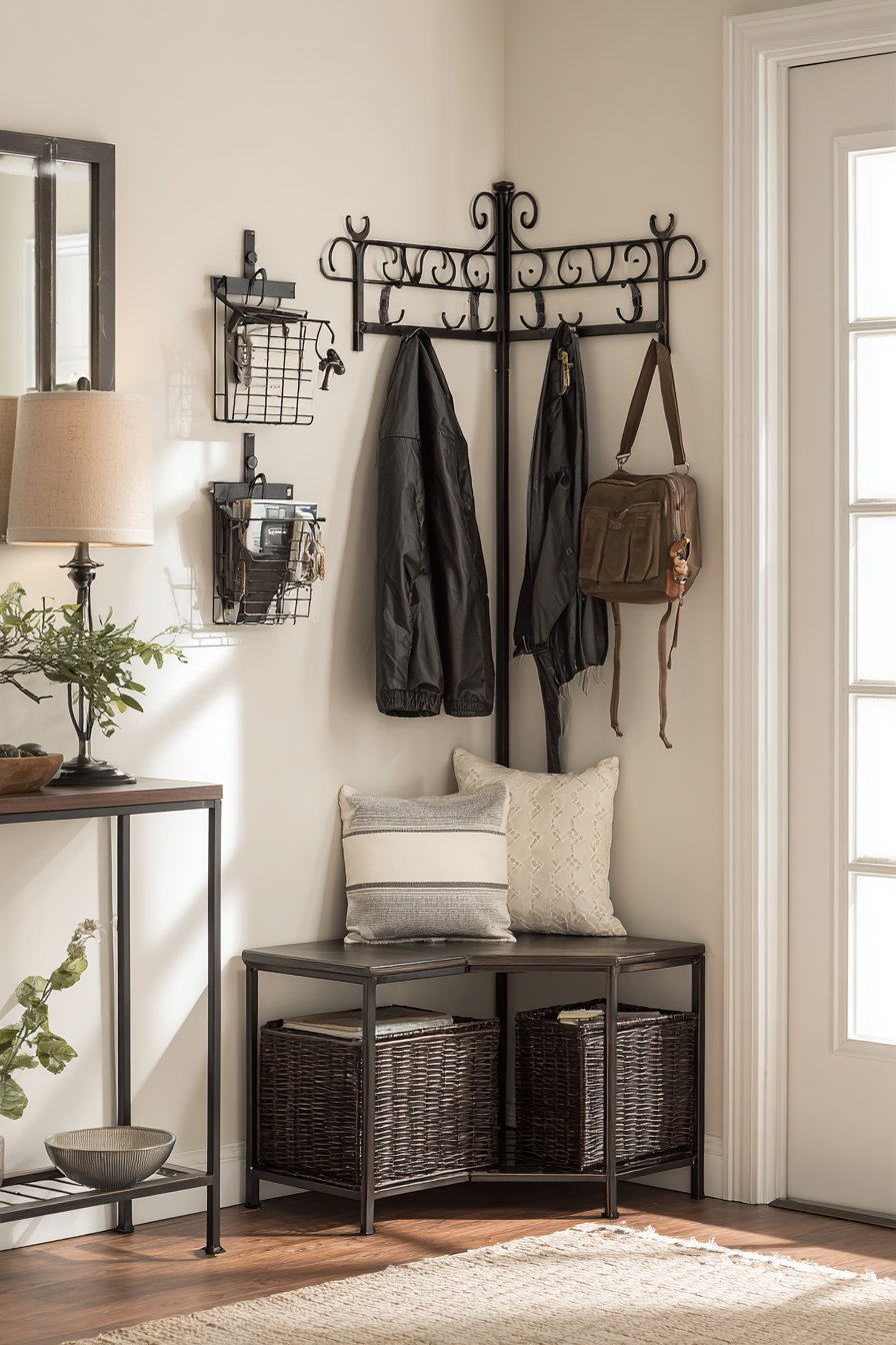 A corner entryway organization station featuring room corner decor ideas creates a hardworking space that manages the daily influx and outflow of people and possessions. The corner coat rack in oil-rubbed bronze with multiple hooks at varying heights accommodates jackets, bags, scarves, and umbrellas for family members of different ages. The oil-rubbed finish brings sophisticated warmth while its slightly textured surface resists fingerprints and minor scratches better than polished metals.