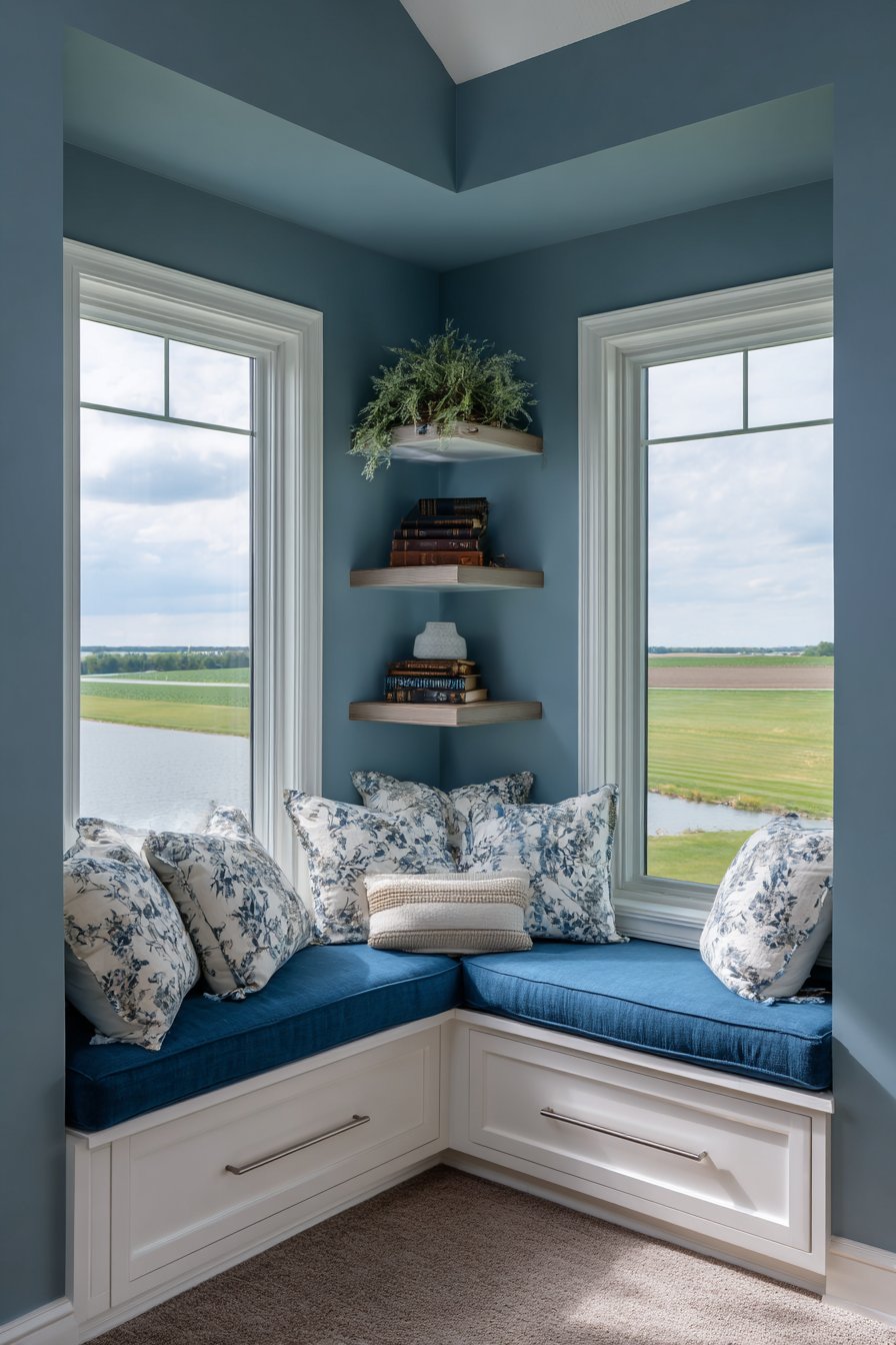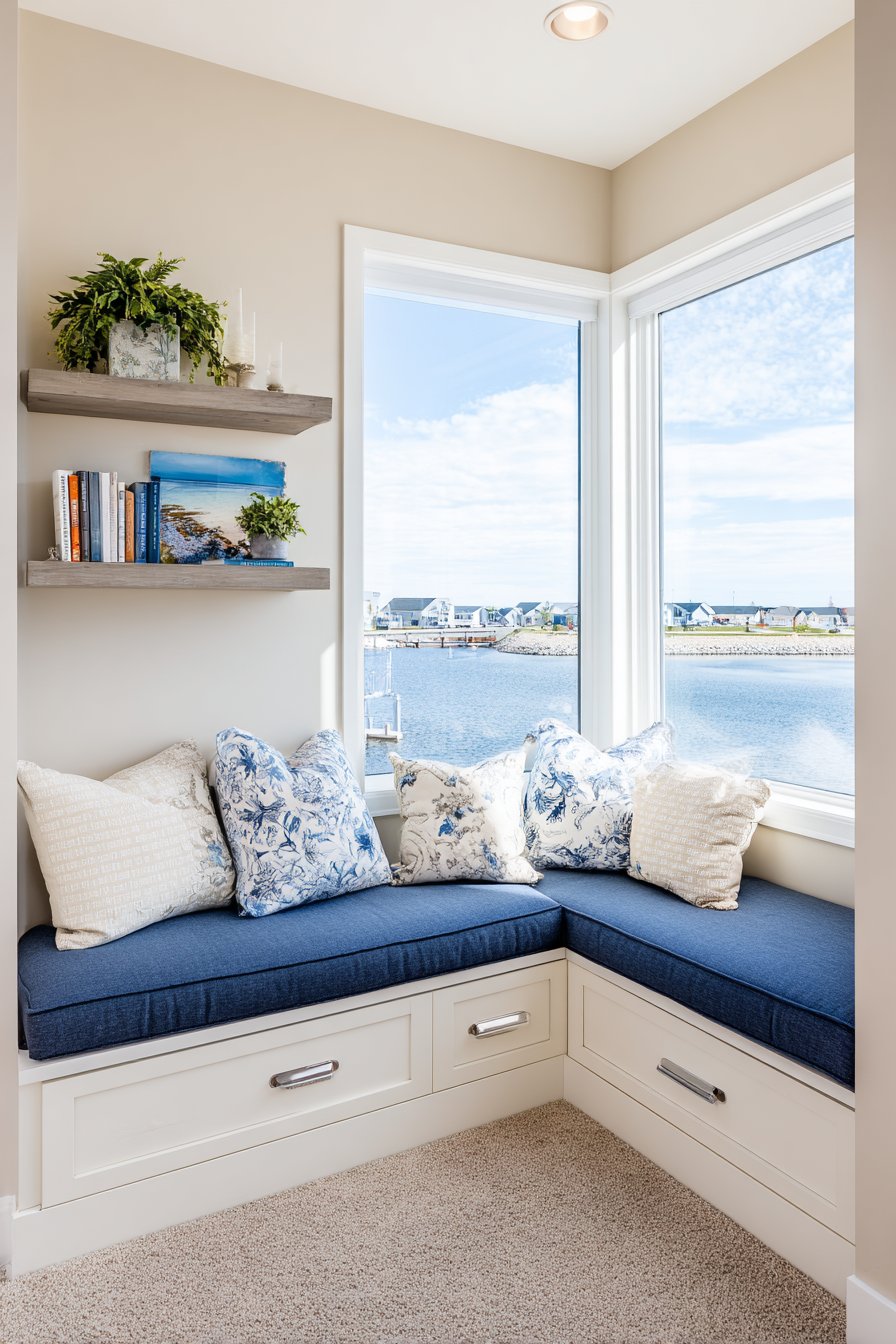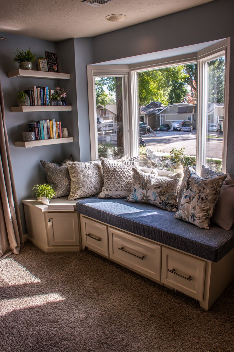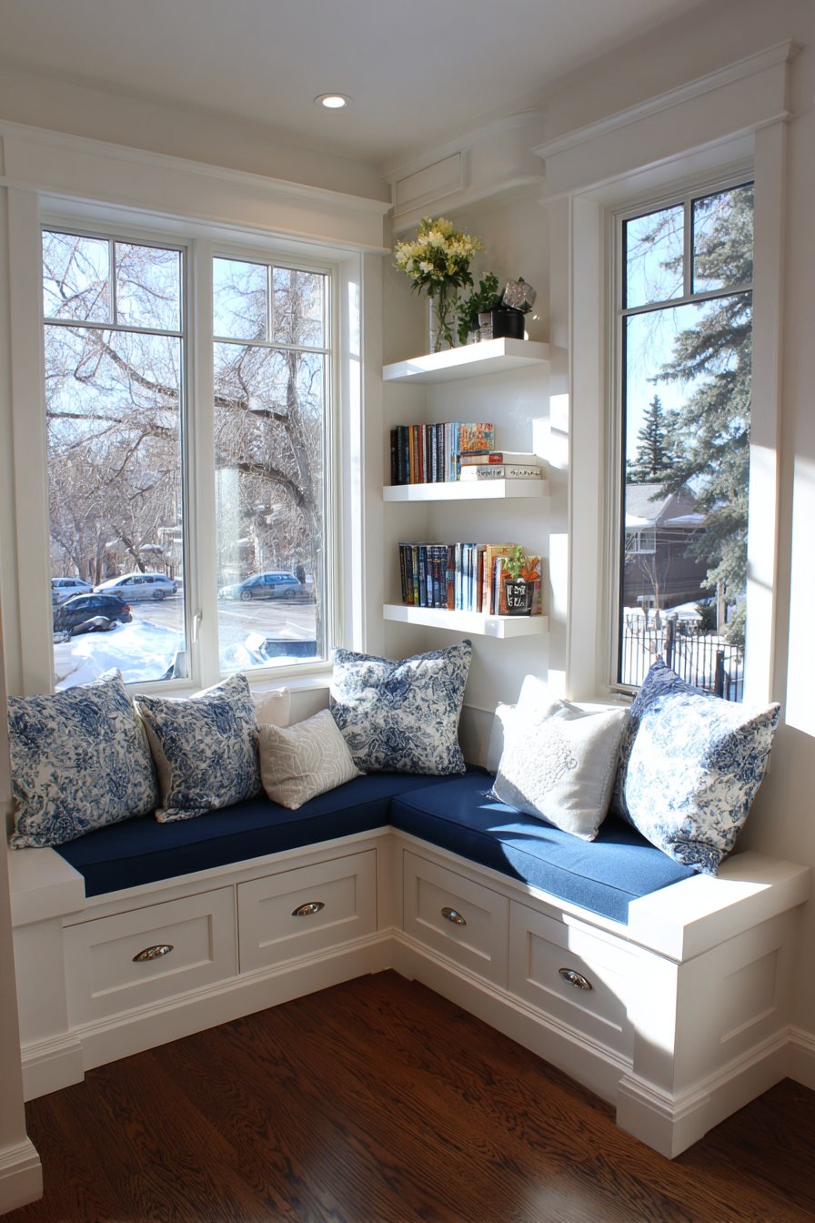 Key Design Tips: Build the window seat at a comfortable sitting height of 18-20 inches with depth of at least 20 inches for adult comfort. Add a hinged seat top for easy access to storage below, or install drawer slides rated for the weight of stored items. Choose cushion foam with appropriate density—high-density foam (at least 2.5 pounds per cubic foot) maintains support and doesn’t flatten quickly. Install shelving at heights that don’t interfere with window operation or sitting comfort. Add a reading lamp nearby for evening use when natural light fades.