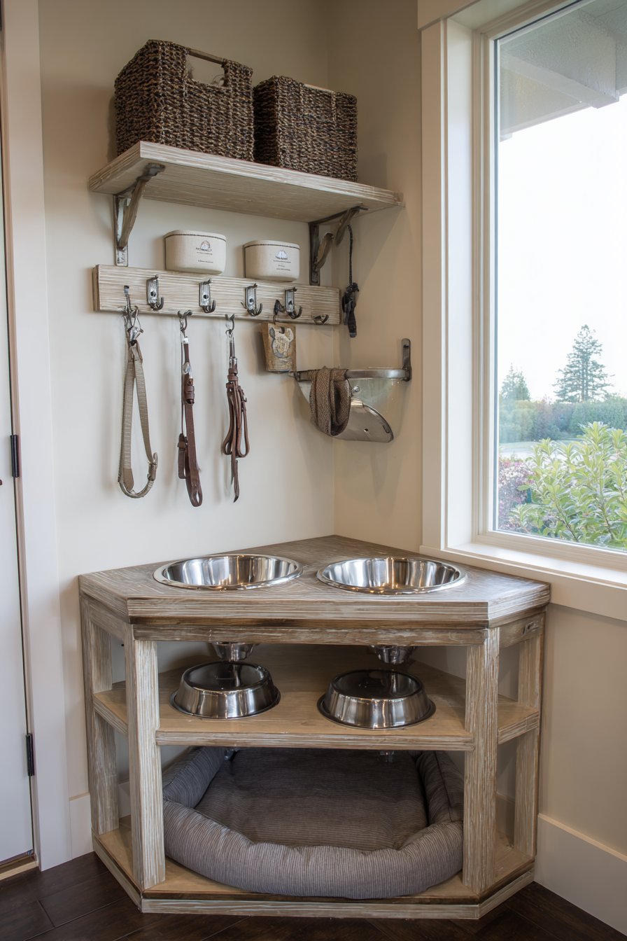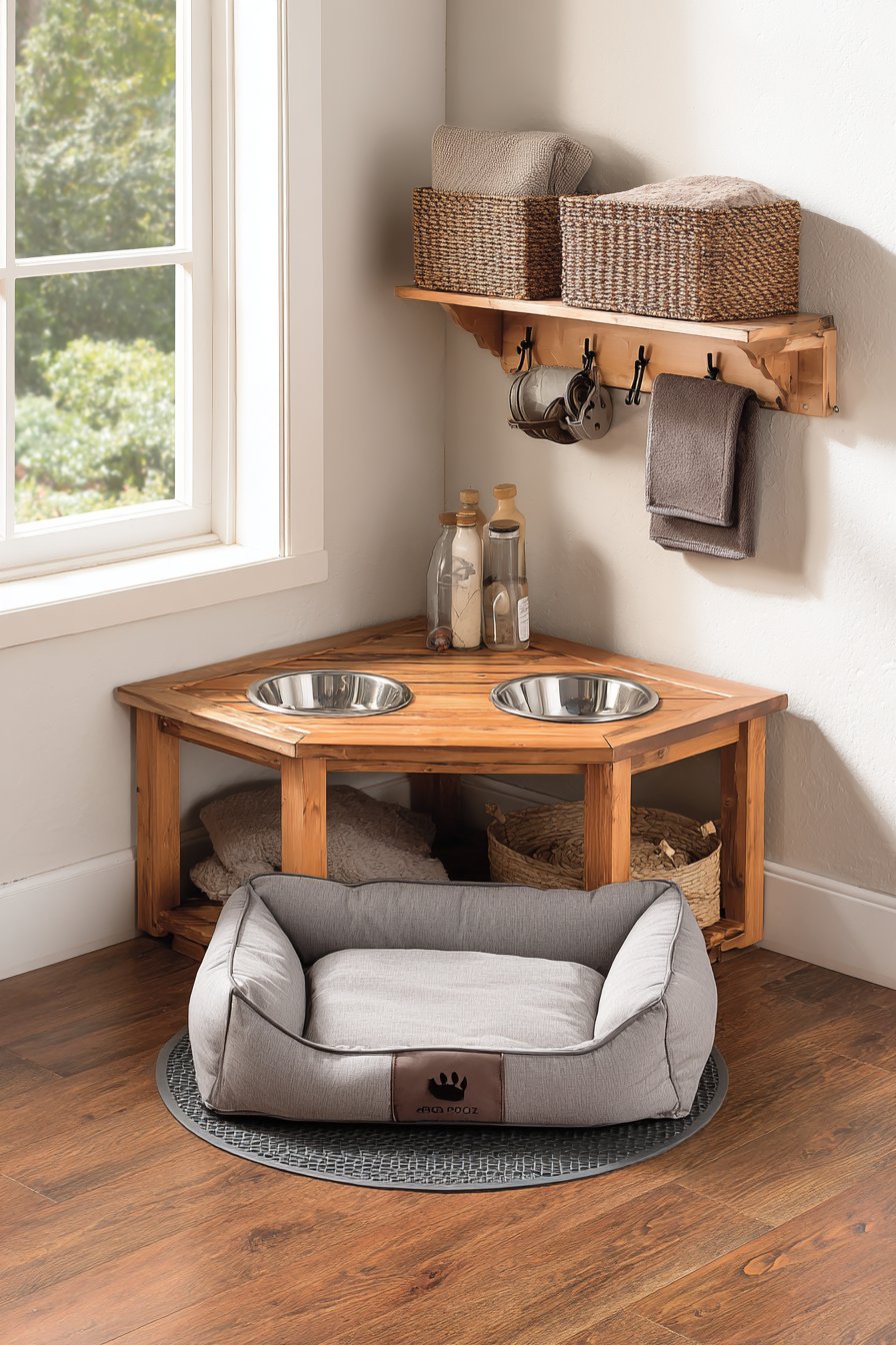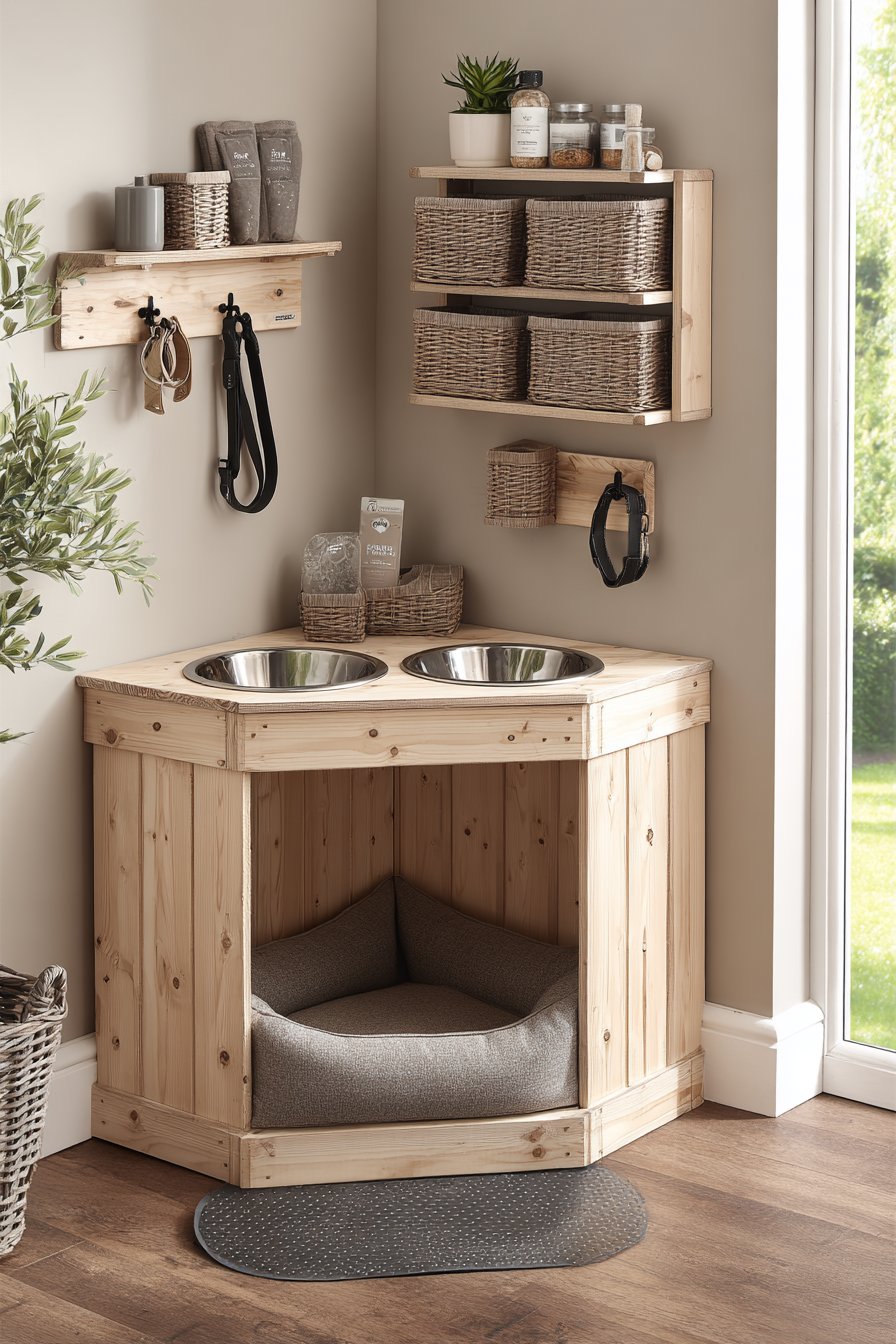 A corner pet station showcasing room corner decor ideas creates a dedicated, organized area for pet care that respects both animal needs and home aesthetics. The elevated pet feeding station in natural wood with two stainless steel bowls raises food and water to a more comfortable height for medium and large dogs, reducing neck and joint strain during meals. The natural wood construction brings warmth and style far superior to plastic alternatives while the stainless steel bowls are dishwasher-safe and resist bacteria growth.