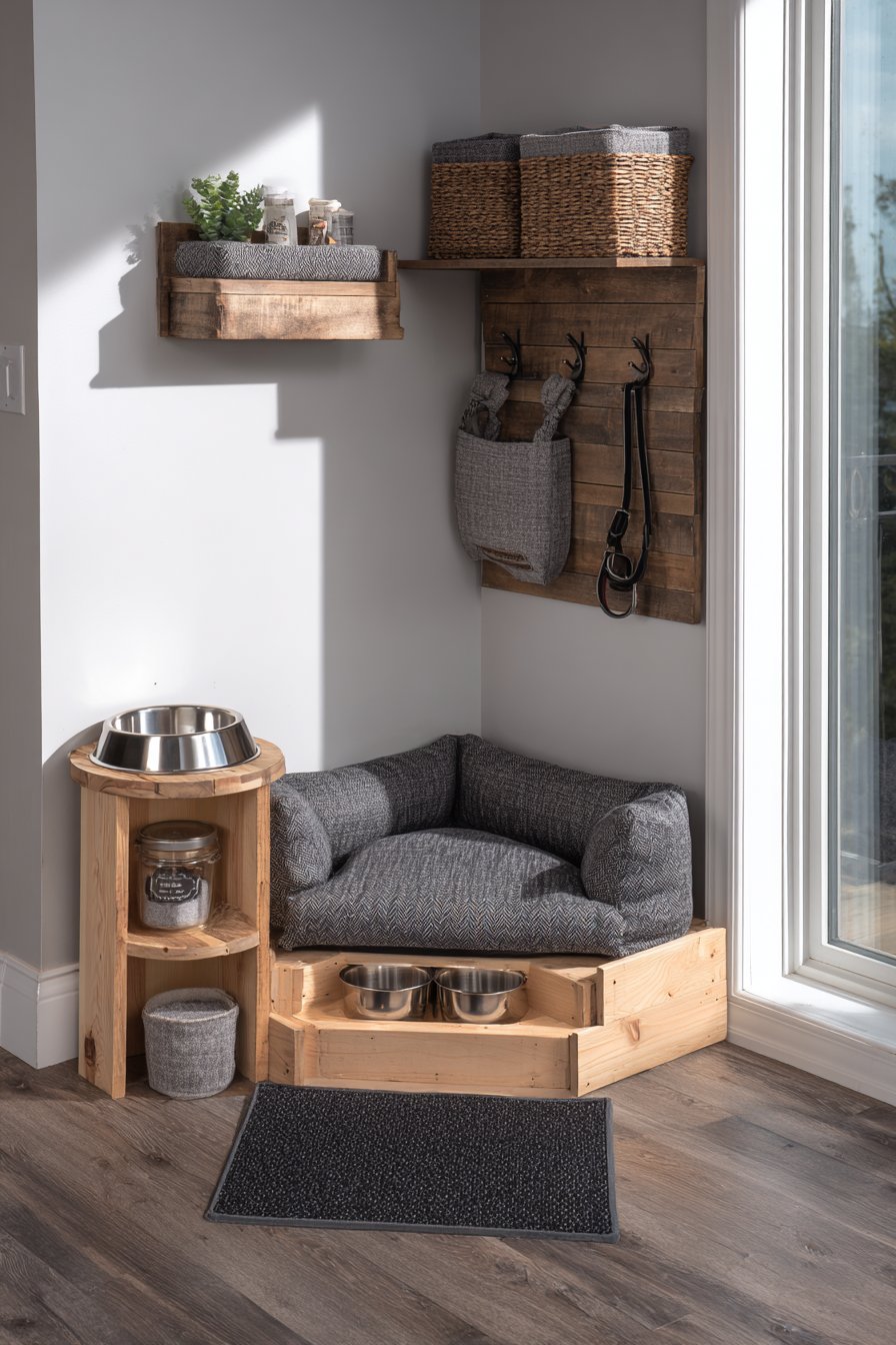 A triangular pet bed with washable grey canvas cover fits perfectly in the corner, its shape designed specifically to utilize corner geometry while providing comfortable rest space. The grey color hides dirt better than lighter tones while remaining sophisticated enough for visible placement in main living areas. Wall-mounted storage hooks hold leashes and collars at accessible heights, keeping these frequently used items organized and preventing the morning scramble to find walking equipment.