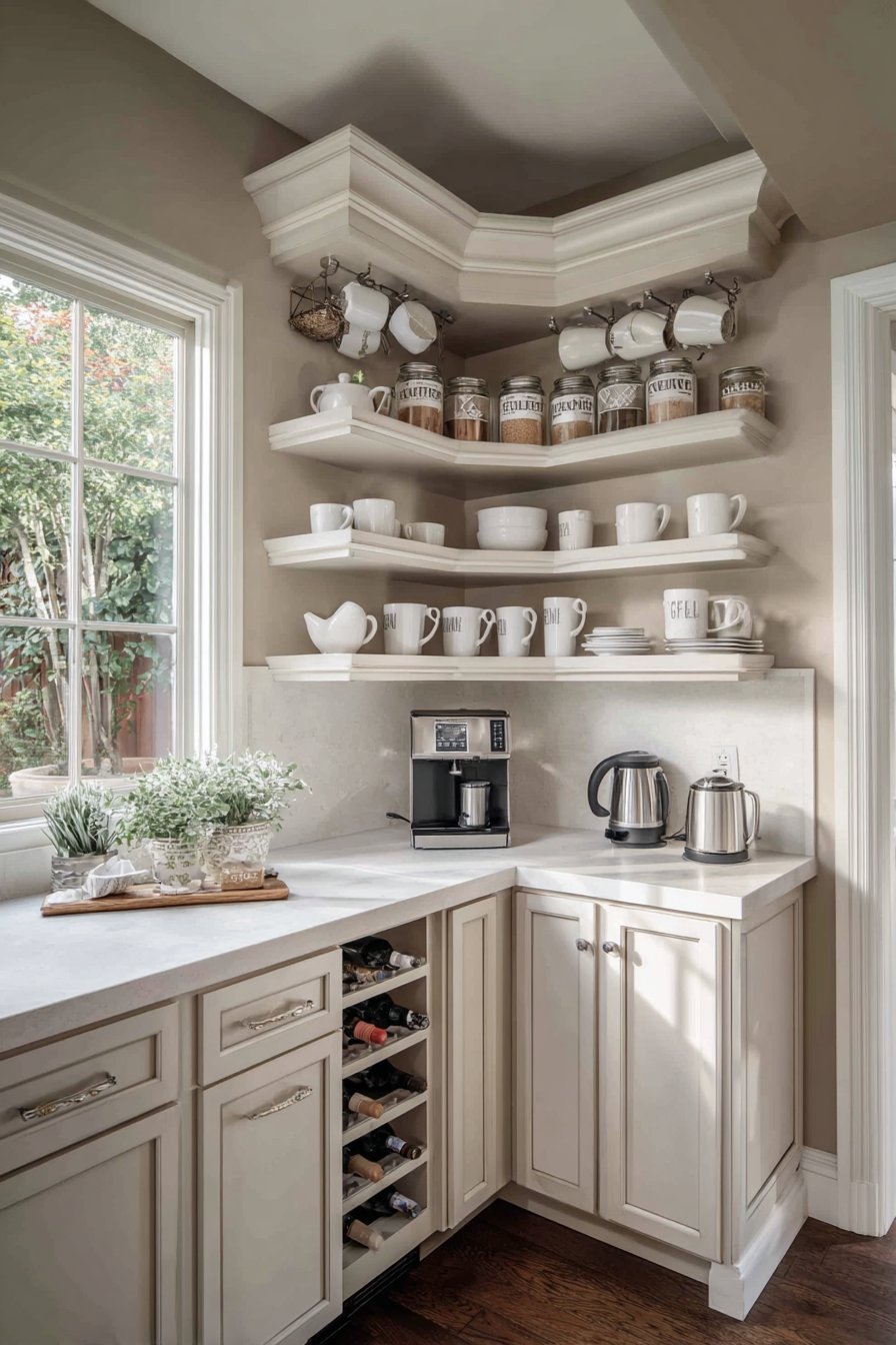 A corner beverage station featuring room corner decor ideas brings café-style convenience to home kitchens or breakfast areas. The compact corner-fitted countertop in white quartz provides a durable, stain-resistant surface supporting a coffee maker and electric kettle. The white quartz reflects light beautifully while its non-porous surface resists coffee stains, water rings, and heat damage—essential properties for a station dedicated to hot beverage preparation.