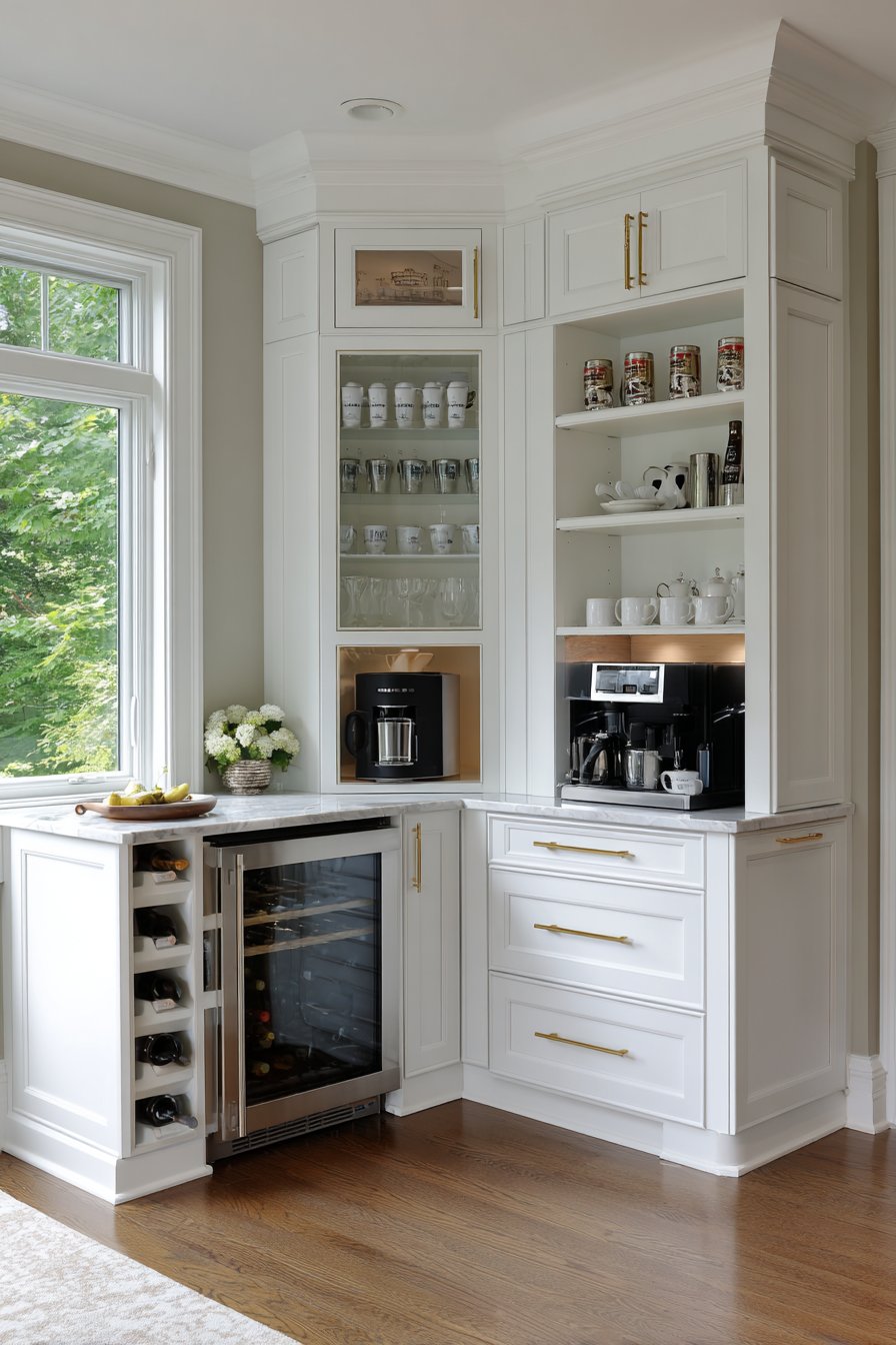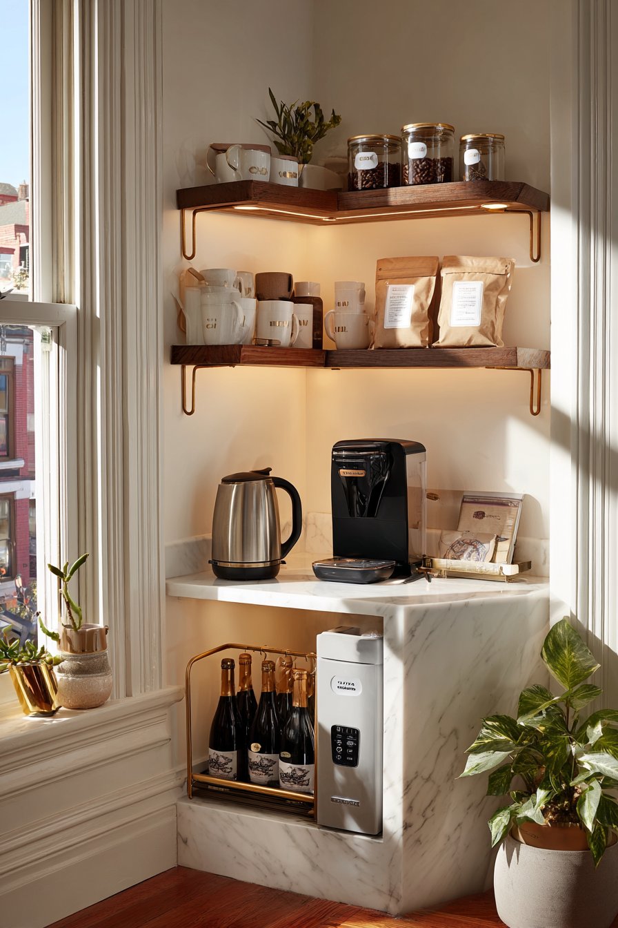 A mini-fridge tucked below provides cold storage for milk, creamer, white wine, and other chilled beverages, eliminating trips to the main refrigerator and creating a complete beverage service area. Task lighting under upper shelves illuminates the workspace, making early morning preparation easier while adding ambient glow during evening use. Natural light from an adjacent window supplements the functional lighting while views outside provide pleasant distraction during the coffee brewing process.