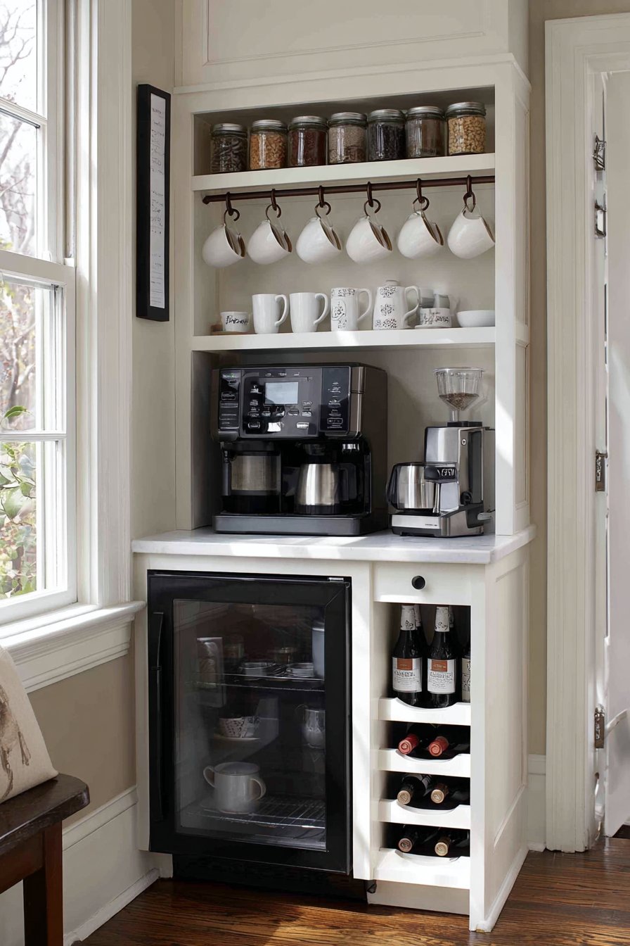 Key Design Tips: Position the coffee maker near an outlet and ensure adequate clearance above for filling the water reservoir and accessing filters. Install shelving high enough to accommodate your tallest mugs on hooks without crowding. Choose a mini-fridge with sufficient capacity for your household’s beverage needs while fitting in the allocated space—measure carefully before purchasing. Use canisters with airtight seals to maintain coffee and tea freshness. Add a small drawer or basket for coffee filters, tea infusers, and other consumables to keep the countertop clear and functional.