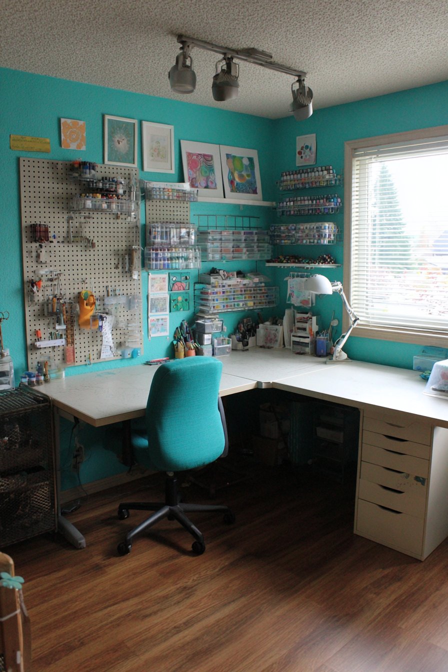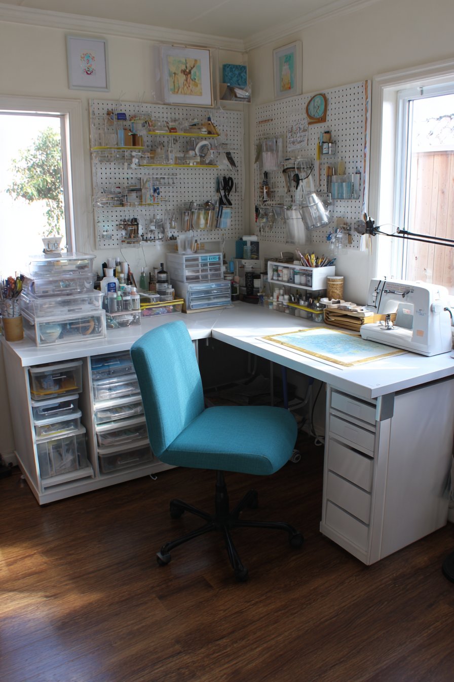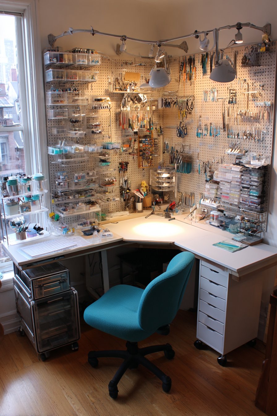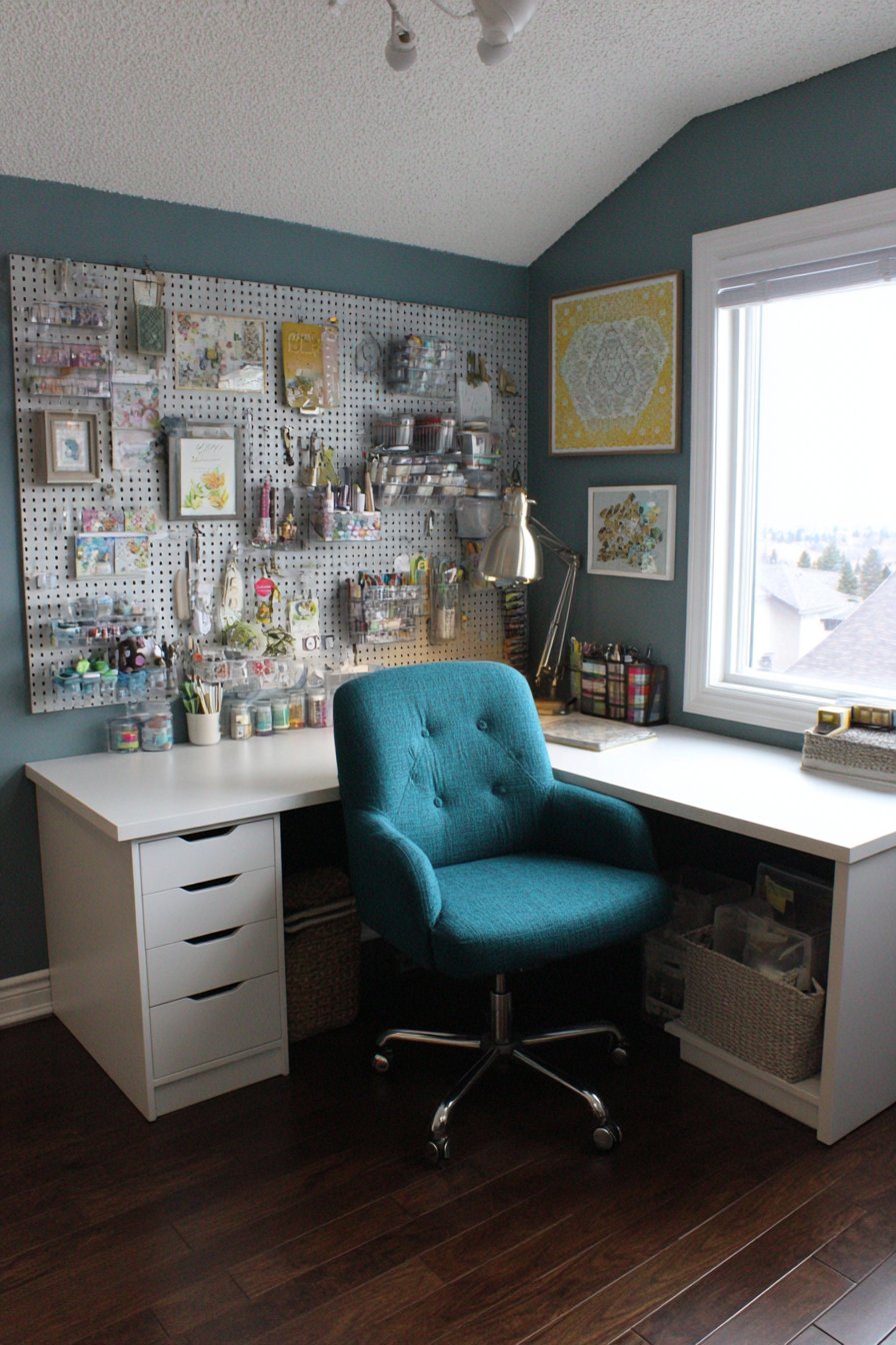 A pegboard system on both corner walls organizes supplies with clear containers holding buttons, beads, ribbons, and other small items, alongside hanging tools like scissors, rulers, and cutting mats. Pegboards offer unmatched flexibility—hooks and containers can be rearranged as projects and needs change, adapting to everything from scrapbooking to jewelry making to model building. A comfortable task chair in teal fabric on casters allows mobility around the corner workspace while the pop of color adds personality and creative energy.