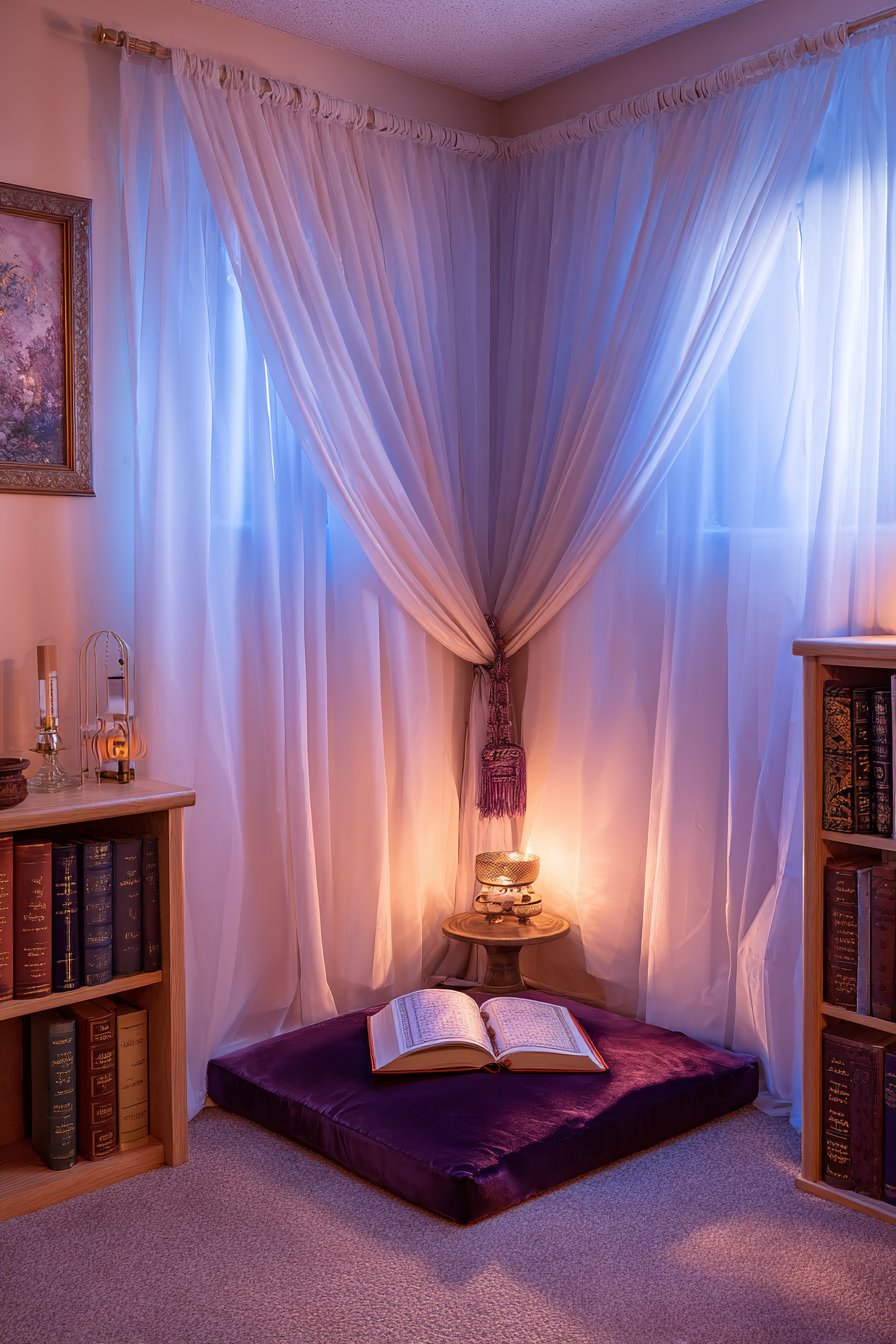 A corner shelf at floor level holds religious texts, prayer beads, and candles arranged with respect and intention. These items aren’t merely decorative—they’re active tools in spiritual practice, positioned for easy access during prayer or meditation sessions. Sheer flowing curtains in white create a sense of separation from the rest of the room, providing privacy and focus without complete enclosure. The lightweight fabric moves gently with air currents, adding subtle movement that can enhance meditative states.