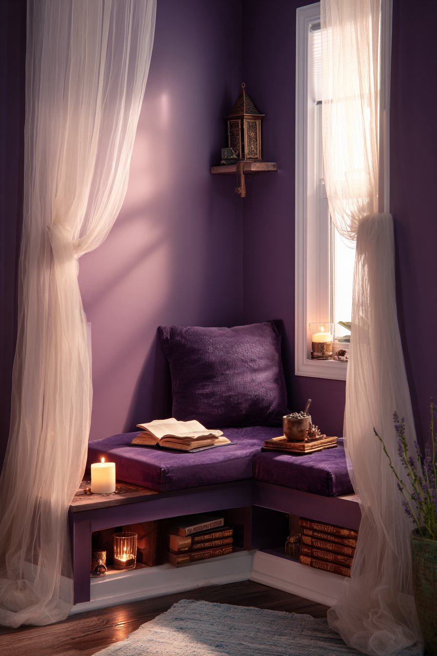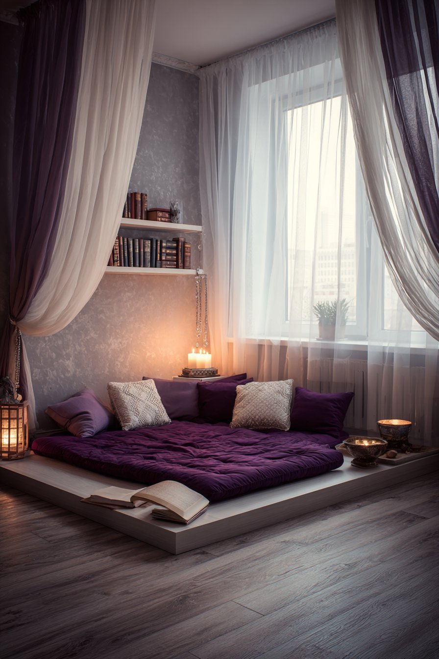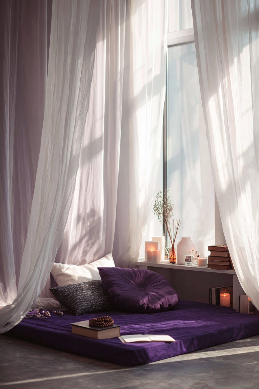 A corner prayer or meditation space showcasing room corner decor ideas provides a dedicated area for spiritual practice, contemplation, and connection within the home. A meditation cushion in deep purple on a small platform creates a designated spot for seated practice, with the elevated platform subtly setting this area apart from the rest of the room both physically and symbolically. The purple color has long associations with spirituality and contemplation across many traditions.