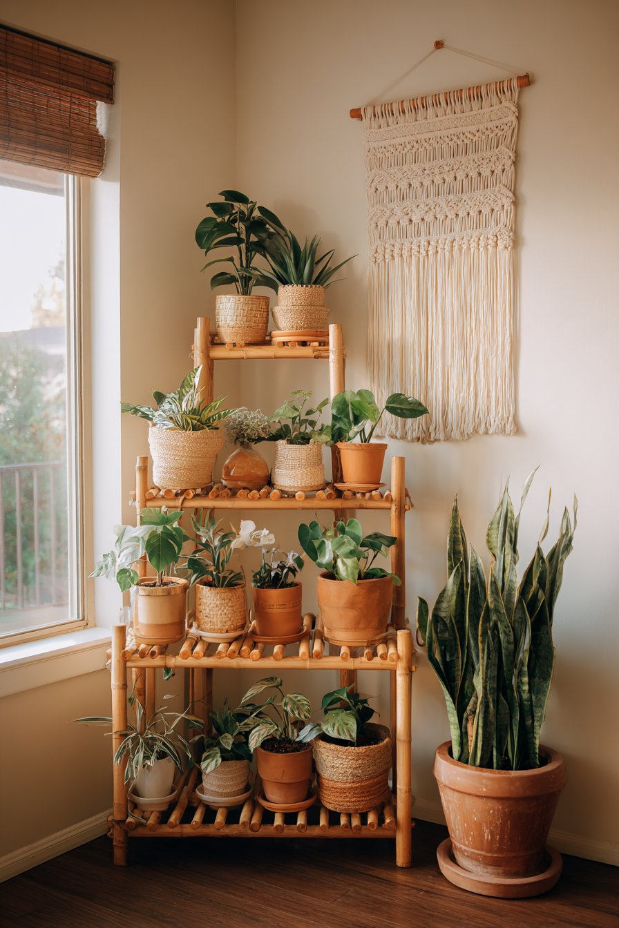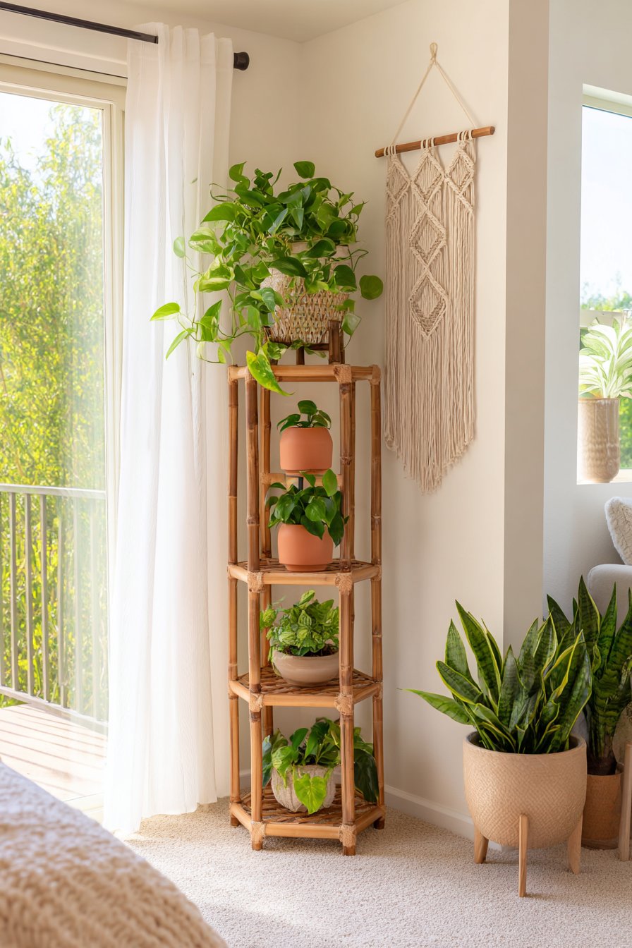 Creating a botanical corner display showcasing room corner decor ideas brings the tranquility and air-purifying benefits of nature directly into your living space. A tiered plant stand crafted from natural bamboo serves as the architectural foundation, its ascending levels creating visual rhythm while accommodating various indoor plants including trailing pothos with heart-shaped leaves, upright snake plants with striking variegated patterns, and graceful peace lilies with their distinctive white blooms. The bamboo material choice is intentional—its natural texture and warm honey tones complement the greenery while its sustainable harvesting aligns with the eco-conscious values many plant enthusiasts hold.