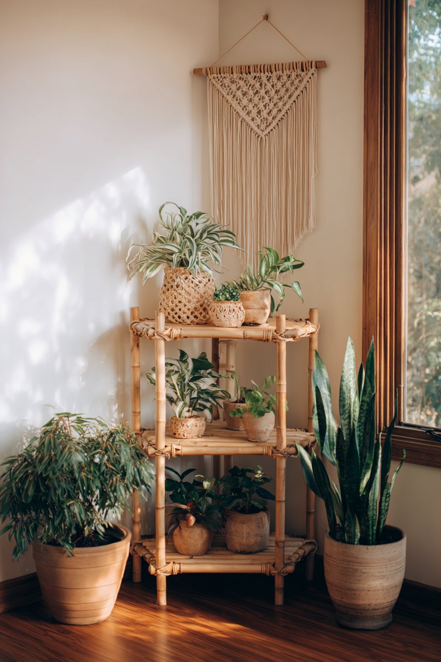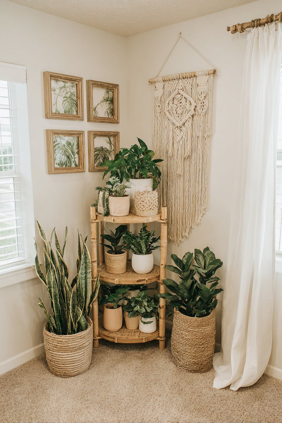 Above this verdant arrangement, a macramé wall hanging in natural cotton rope adorns the corner walls, creating vertical interest that draws the eye upward and emphasizes the room’s height. The intricate knotwork of macramé adds artisanal charm and textural complexity that contrasts beautifully with the smooth, glossy leaves below. This handcrafted element introduces bohemian warmth while the negative space within the knotted patterns prevents the corner from feeling too heavy or cluttered.