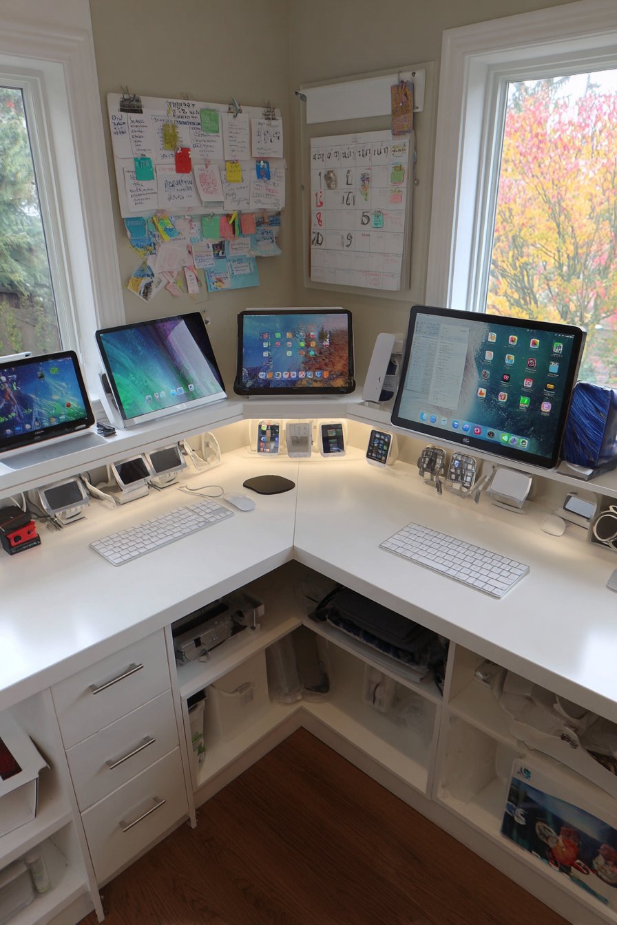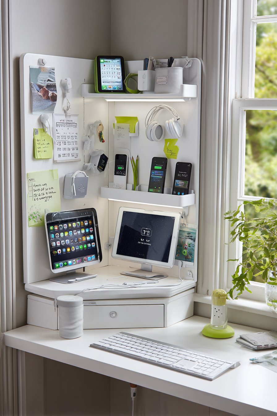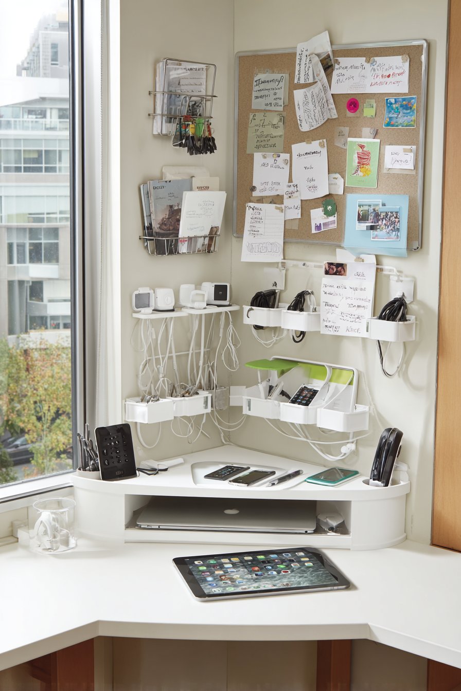 A corner technology charging station featuring room corner decor ideas addresses the modern reality of multiple devices requiring regular charging while maintaining organized, attractive spaces. A wall-mounted corner shelf system in white lacquer holds multiple device charging docks positioned to accommodate phones, tablets, smartwatches, and wireless earbuds simultaneously. The white finish keeps the technical elements feeling clean and integrated rather than creating a tangle of black wires against colored walls.