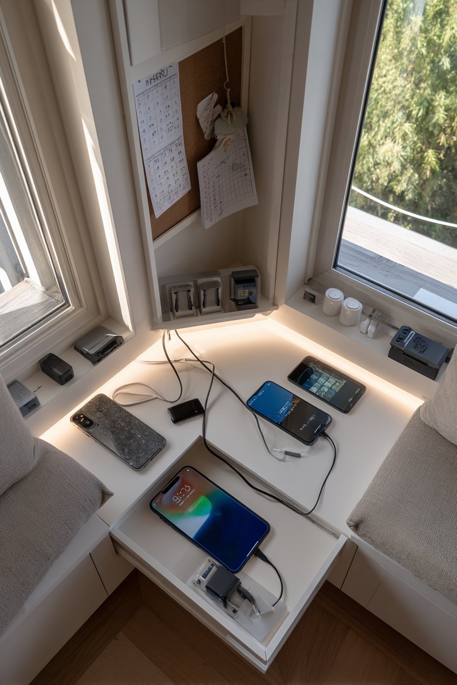 Cable management solutions keep cords organized and hidden—perhaps through built-in channels in the shelving system, adhesive cable clips, or a fabric cable sleeve that gathers multiple cords into a single managed bundle. These solutions prevent the visual chaos of tangled cables while also making it easy to identify which charger serves which device. A small drawer unit below stores extra chargers, charging cables, and accessories for devices not currently in rotation.