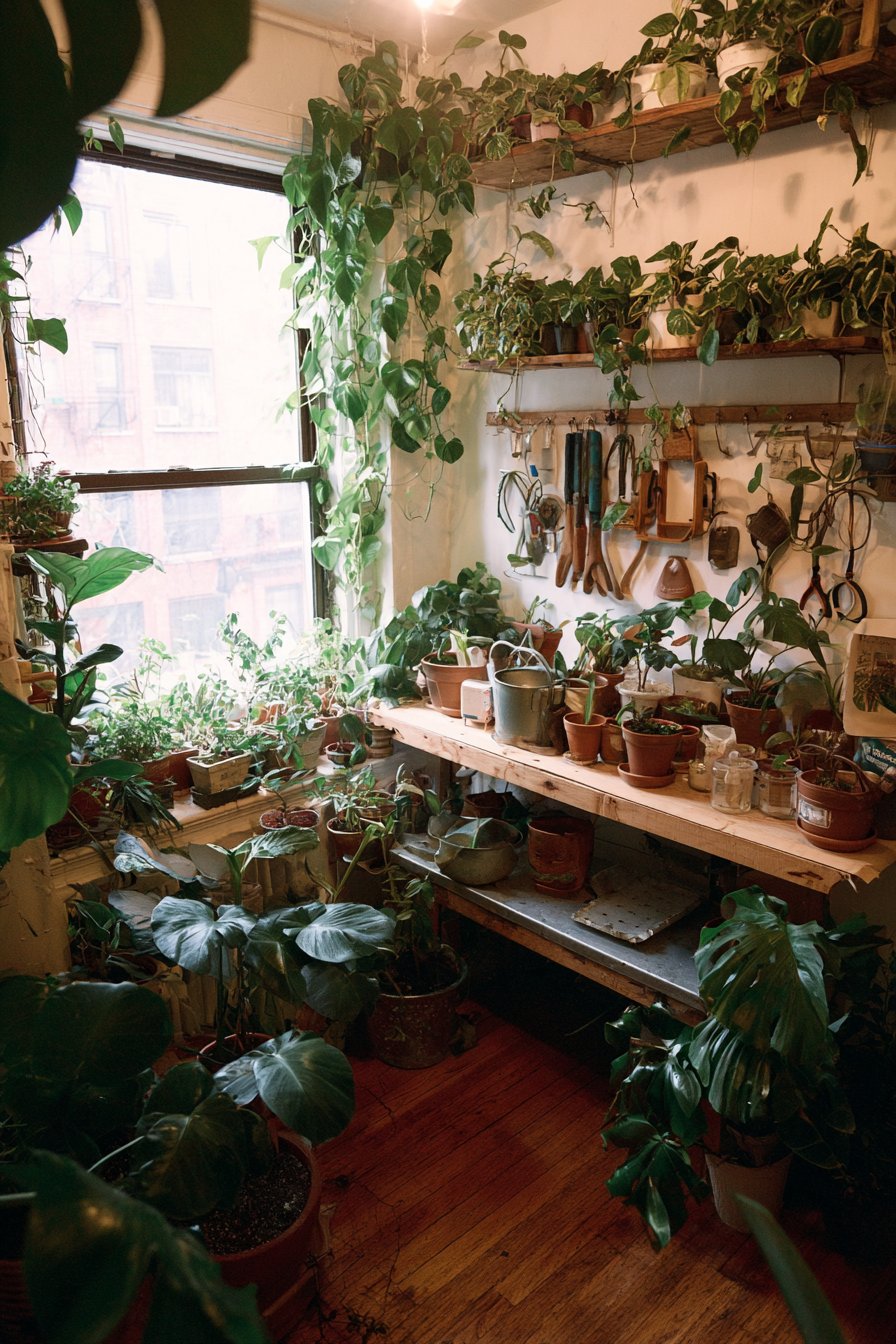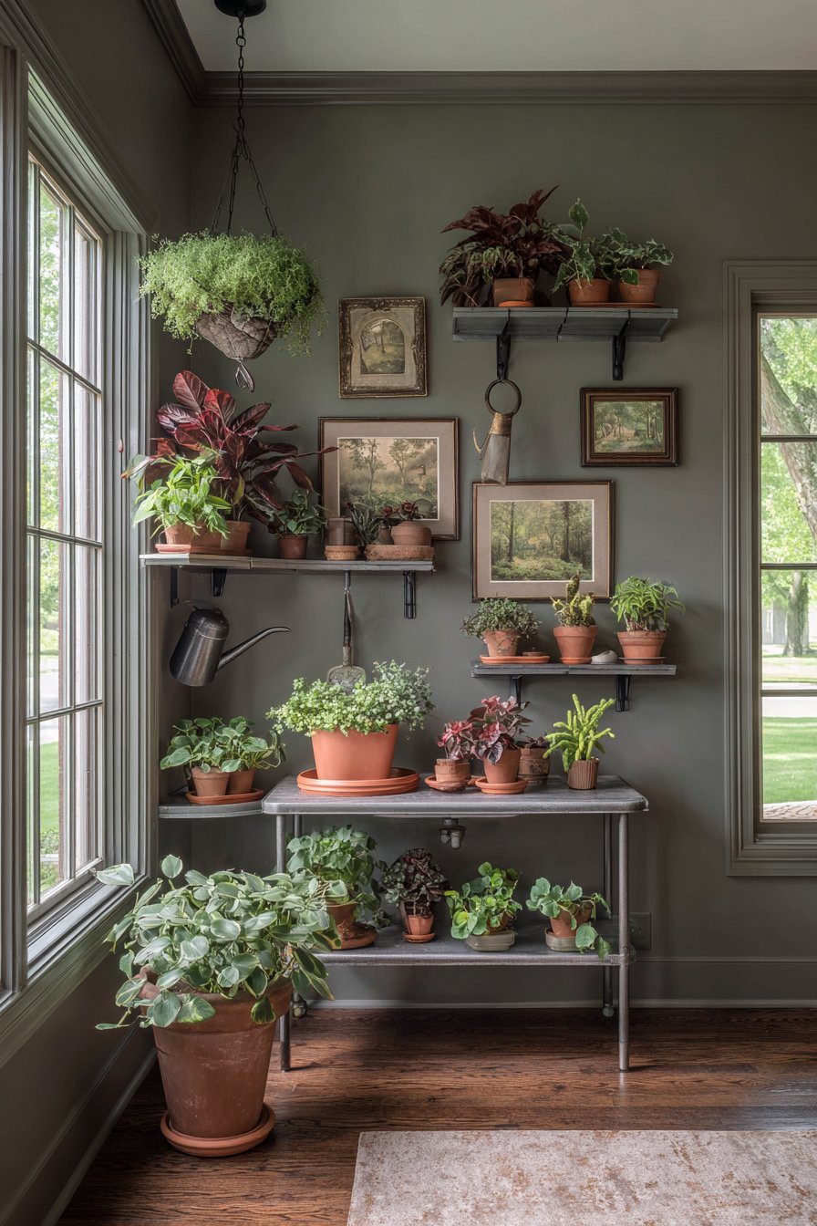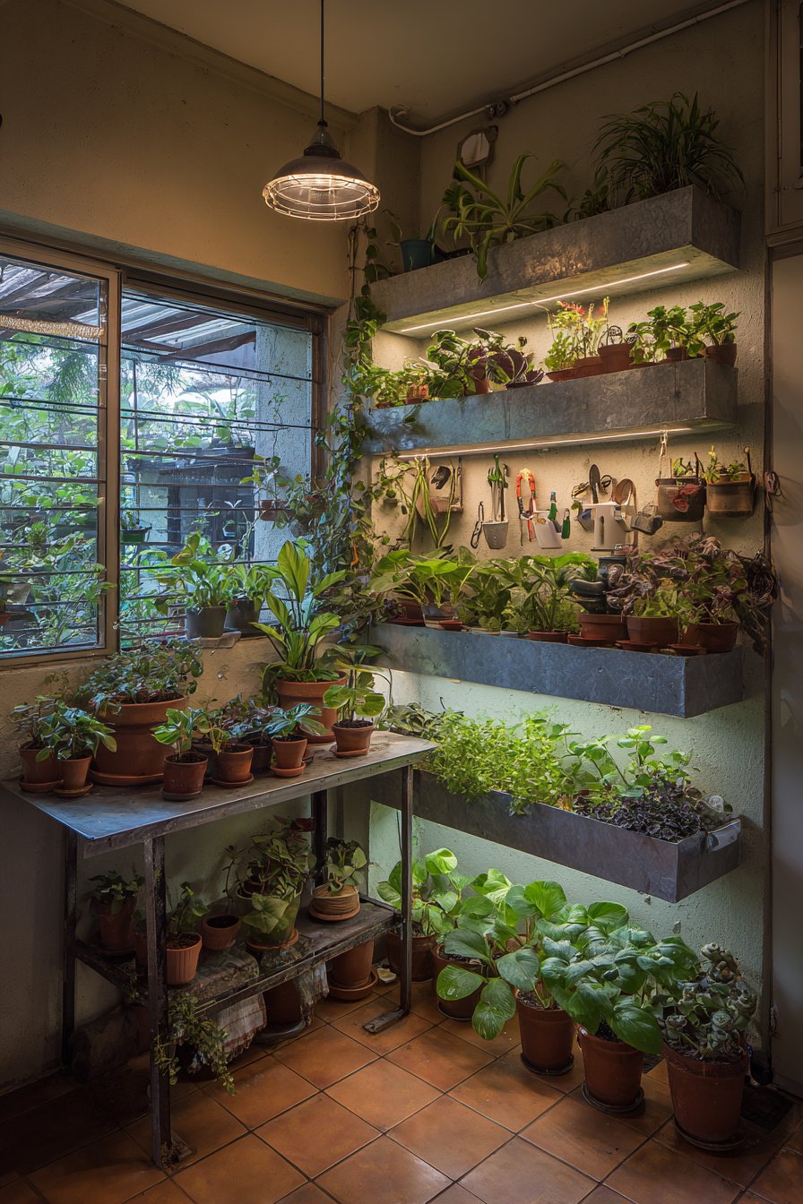 A grow light suspended from the ceiling ensures adequate light for plants even in corners with limited natural window light. Modern LED grow lights provide full-spectrum illumination that supports plant growth while remaining energy-efficient and producing minimal heat. Terracotta saucers catch drainage beneath each planter, protecting walls and floors from water damage while the evaporation from these saucers increases local humidity levels beneficial for many houseplants.