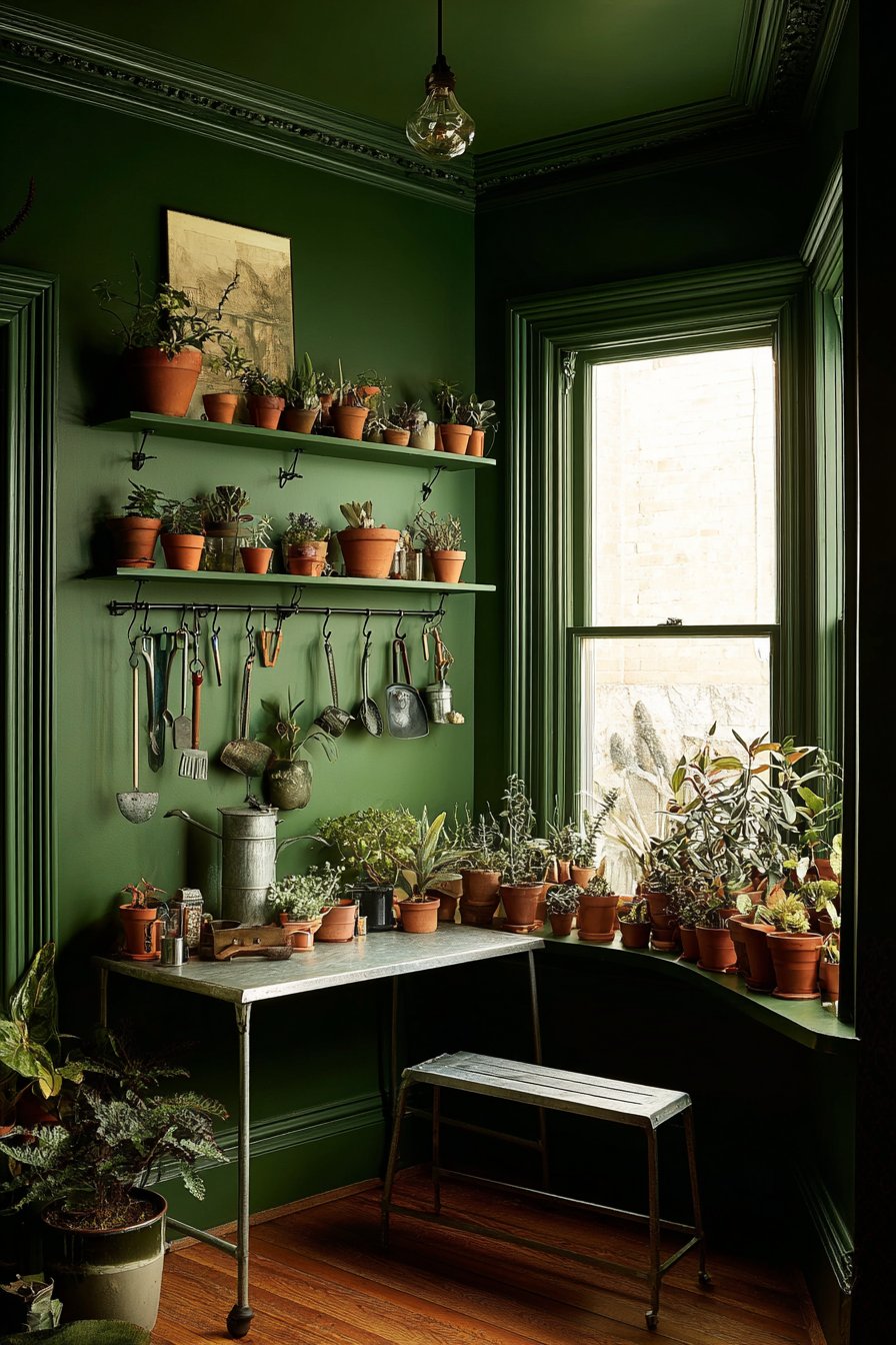 A small potting bench in galvanized metal provides workspace for plant care—repotting, pruning, fertilizing—without requiring you to commandeer kitchen counters or dining tables for these messy tasks. The galvanized metal is inherently water-resistant and develops an attractive patina over time while maintaining durability. Watering can and gardening tools hang from decorative hooks within easy reach, keeping essential equipment organized and accessible.