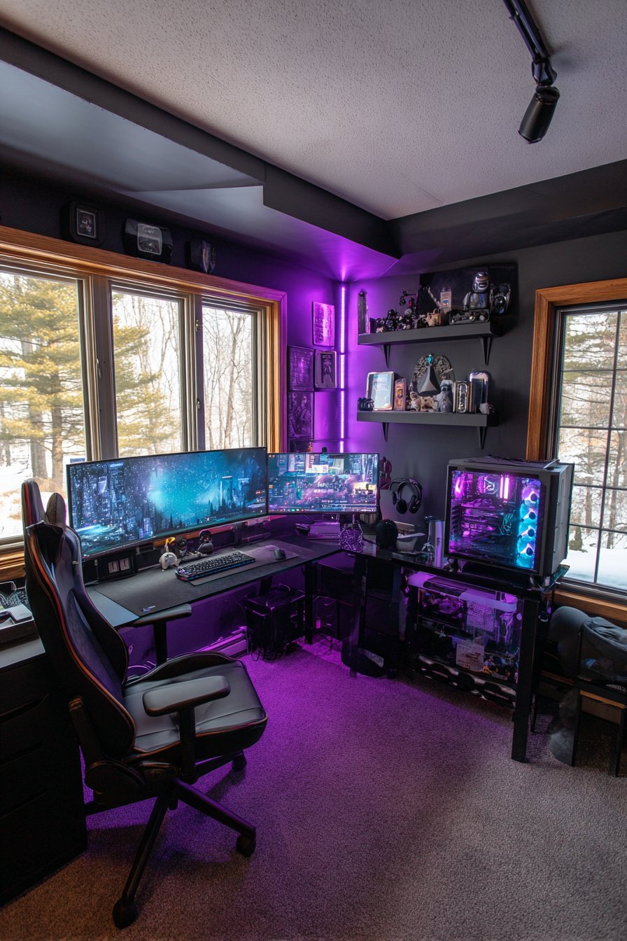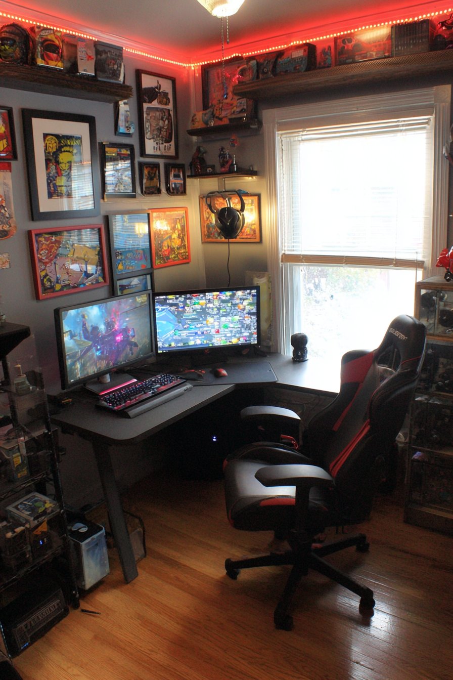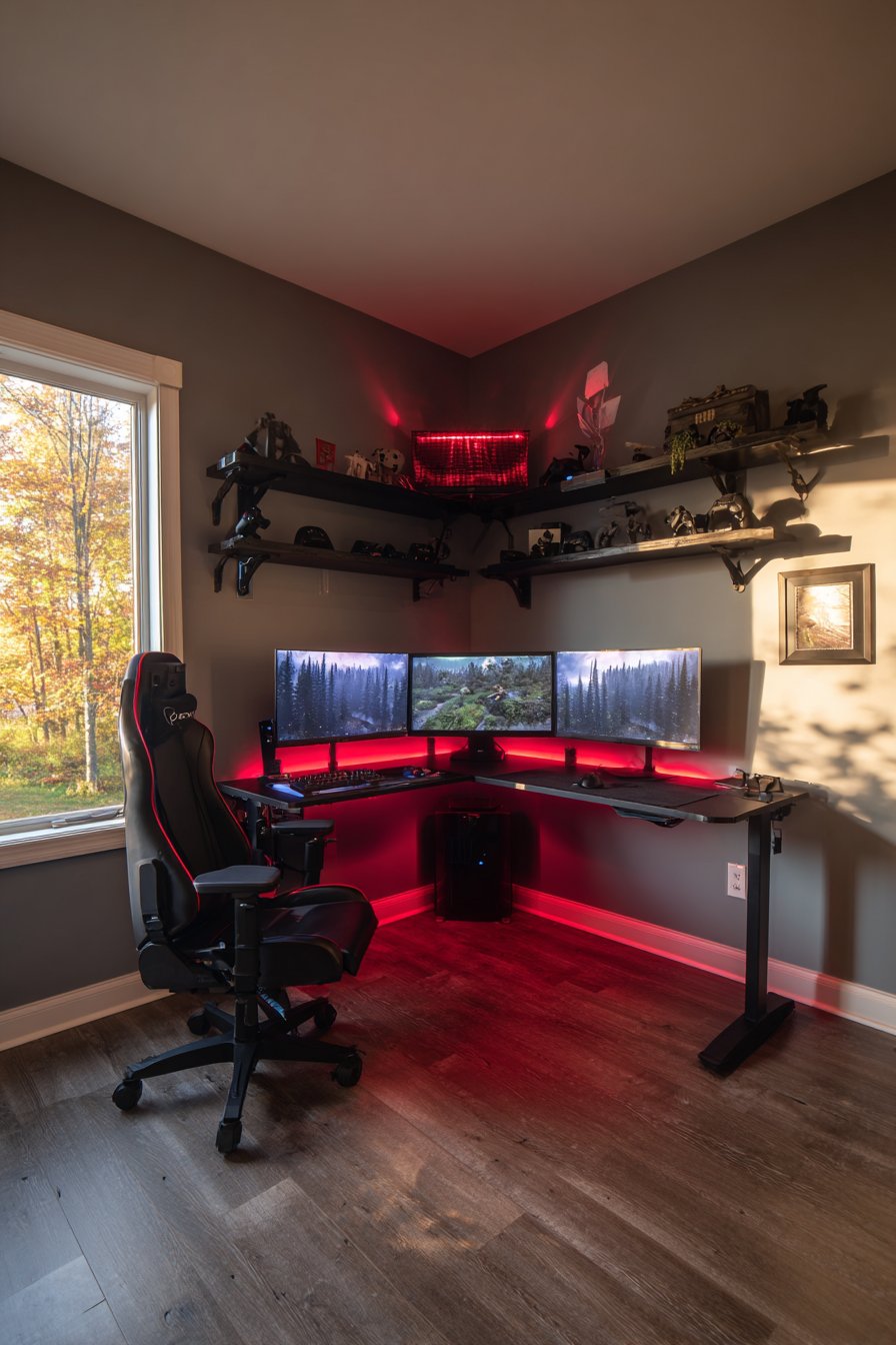A corner gaming setup showcasing room corner decor ideas creates an immersive entertainment space optimized for extended gaming sessions. An L-shaped gaming desk in black finish fits perfectly into the corner, providing ample surface area for dual monitors, keyboard, mouse, and accessories while the dark color reduces visual distraction and helps screens remain the focus. The L-shape allows separation of different activities—perhaps primary gaming on one side and streaming or productivity tasks on the other.