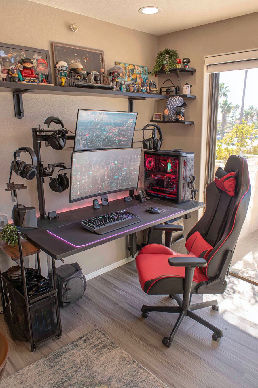 A gaming chair in black and red provides ergonomic seating designed for extended sessions, with adjustable lumbar support, armrests, and recline angle. Floating shelves above display gaming collectibles—limited edition game boxes, figurines from favorite titles, and headset storage that keeps this expensive equipment protected and accessible. Cable management channels keep the numerous wires organized and out of sight.