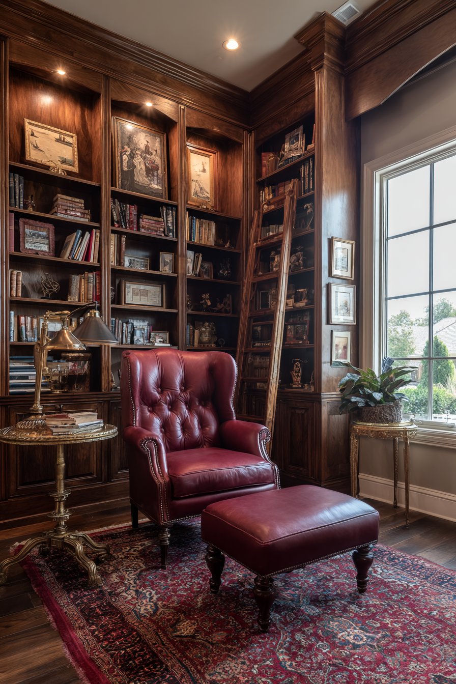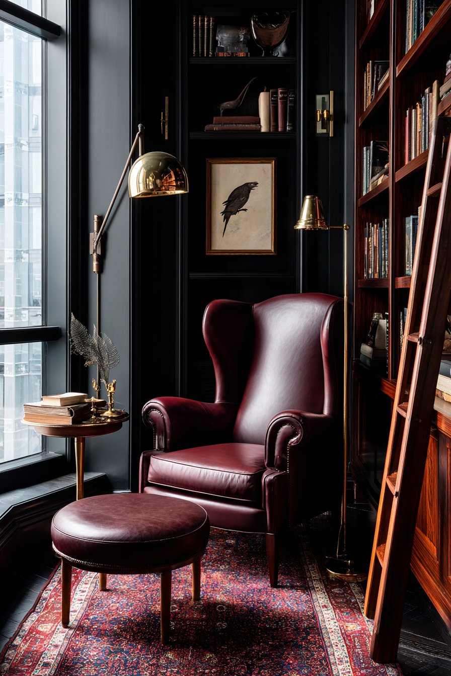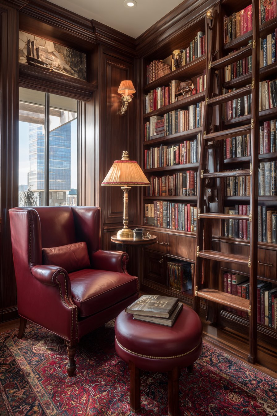 A leather wingback chair in burgundy with matching ottoman centers the reading space, its high back providing support and creating a cocooning effect that enhances focus and comfort during long reading sessions. The leather develops beautiful patina over years of use, actually becoming more attractive with age unlike synthetic materials that degrade. A small side table with antique brass lamp provides reading light positioned to illuminate pages without creating glare or harsh shadows.