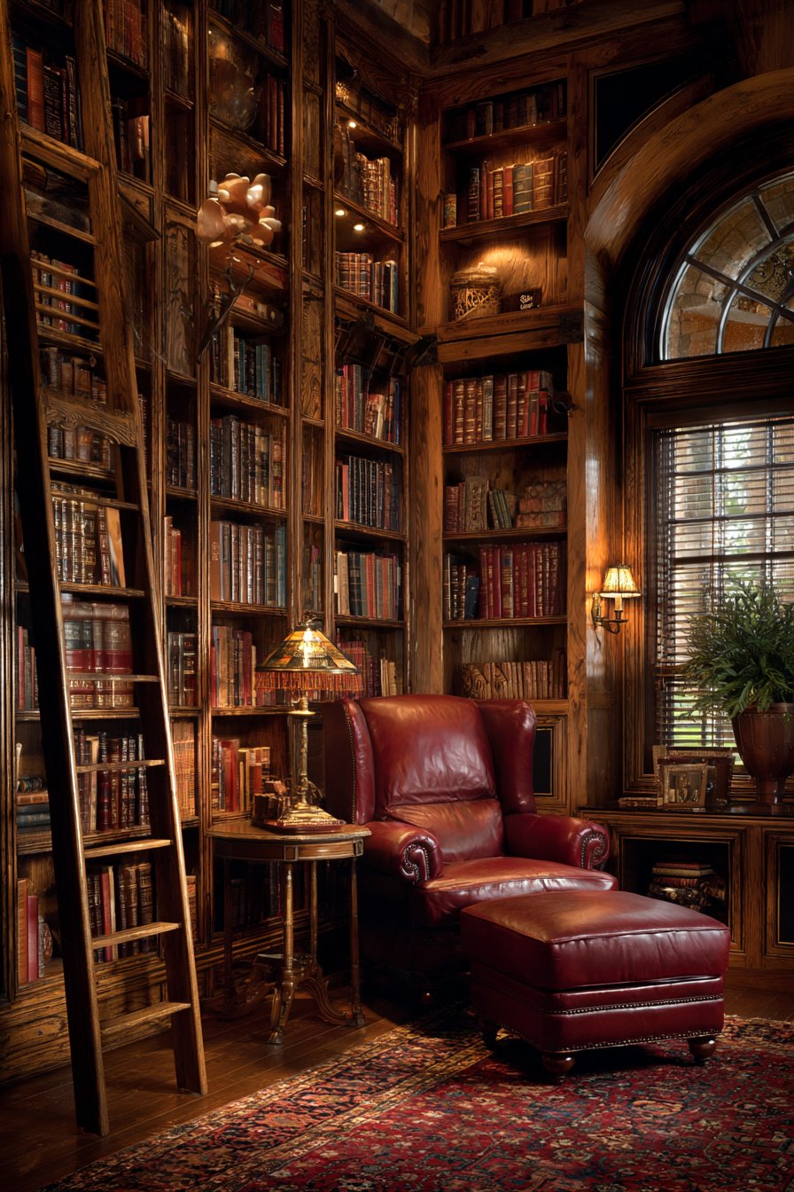 A corner library nook featuring room corner decor ideas creates a personal literary sanctuary that celebrates the physical book in an increasingly digital world. Floor-to-ceiling corner bookshelves in rich mahogany wood create a personal library that holds hundreds of volumes while the deep reddish-brown tones bring warmth and traditional sophistication. A rolling ladder provides access to upper shelves, adding both functionality and classic library aesthetics reminiscent of grand estates and historic libraries.