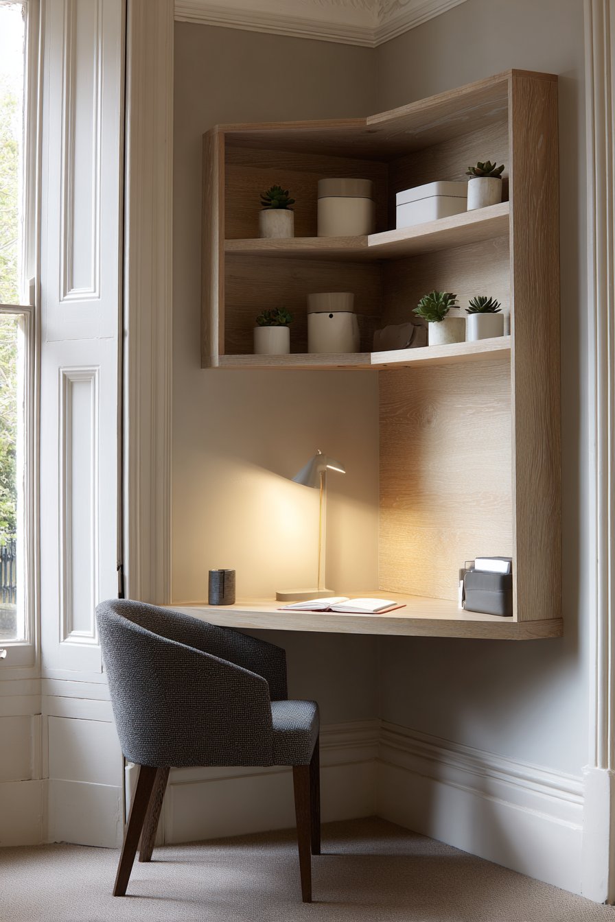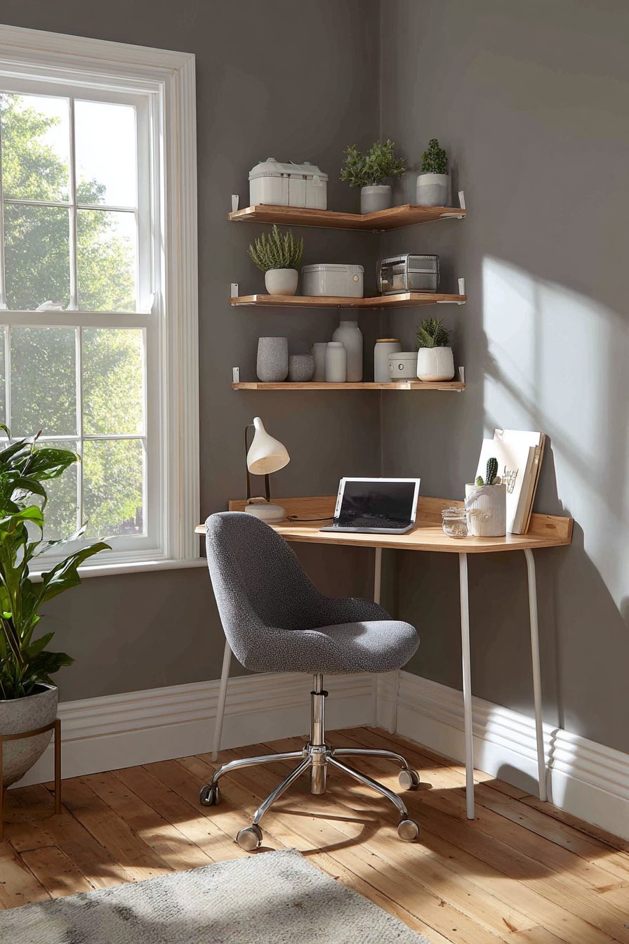 A functional home office corner implementing room corner decor ideas demonstrates how thoughtful design can create productive workspaces even in the most compact homes. An L-shaped floating desk in light oak finish mounted directly into the corner maximizes usable surface area while maintaining an airy, uncluttered appearance. The floating installation keeps floor space clear, making the room feel larger and facilitating easy cleaning—a practical consideration that shouldn’t be overlooked in daily life. The light oak brings warmth and natural beauty without the visual weight of darker woods.