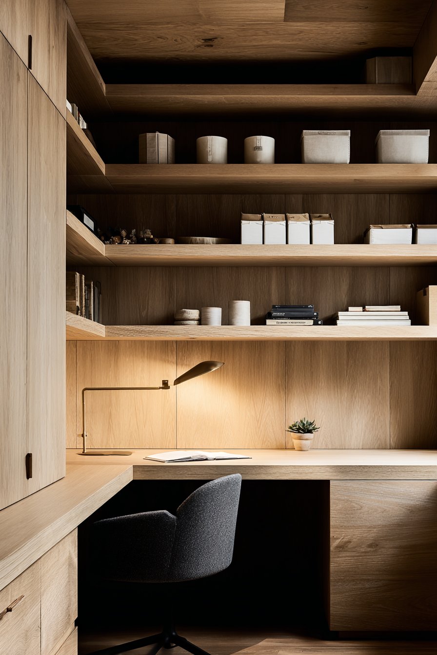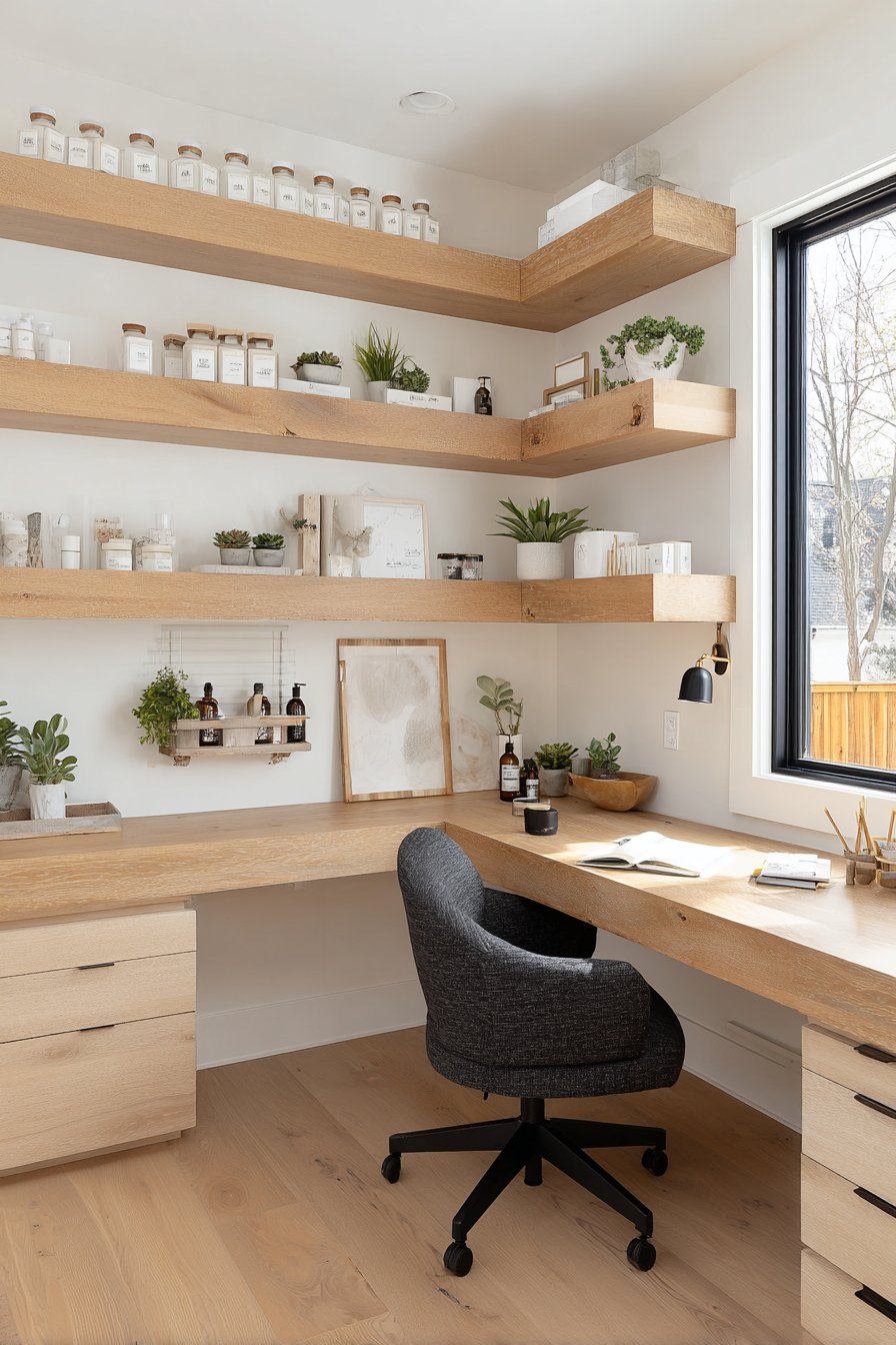 Open shelving installed above the desk displays organized office supplies in matching white containers, small succulents that add life without requiring extensive care, and perhaps a few inspiring art prints or motivational quotes. This vertical storage approach keeps frequently used items within arm’s reach while maintaining the minimalist aesthetic that promotes focus and productivity. The uniform containers create visual calm, preventing the shelves from appearing chaotic despite housing numerous items.