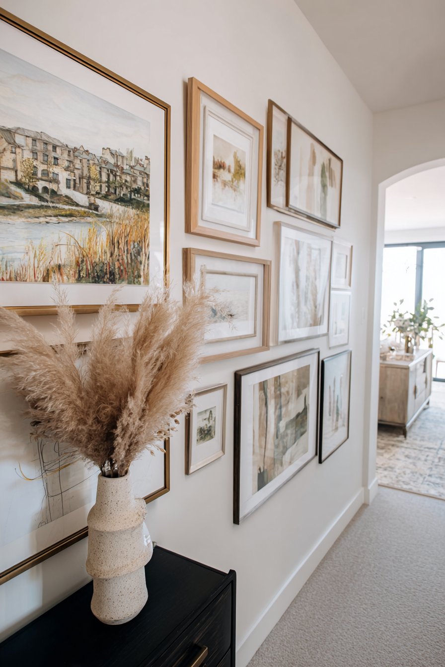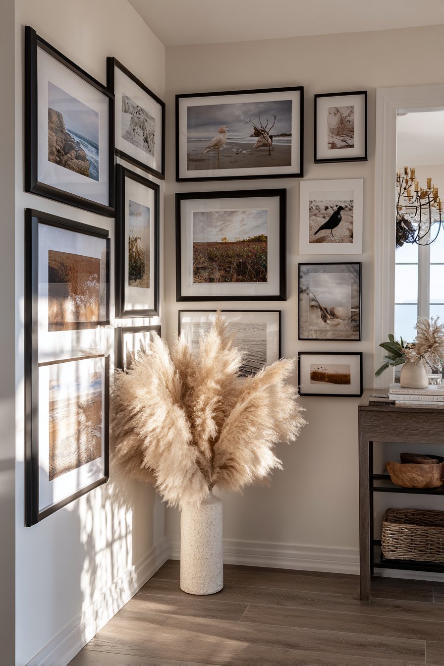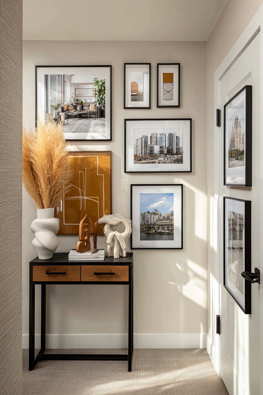 Below this visual feast, a small console table in warm walnut or sleek lacquer holds a sculptural vase filled with dried pampas grass, its neutral tones and organic forms providing a calming counterpoint to the busy wall above. Soft gallery lighting—perhaps from track lights or picture lights—highlights the artwork while natural shadows add depth and dimension. The interplay between artificial and natural illumination changes throughout the day, revealing different aspects of the collection at different times.