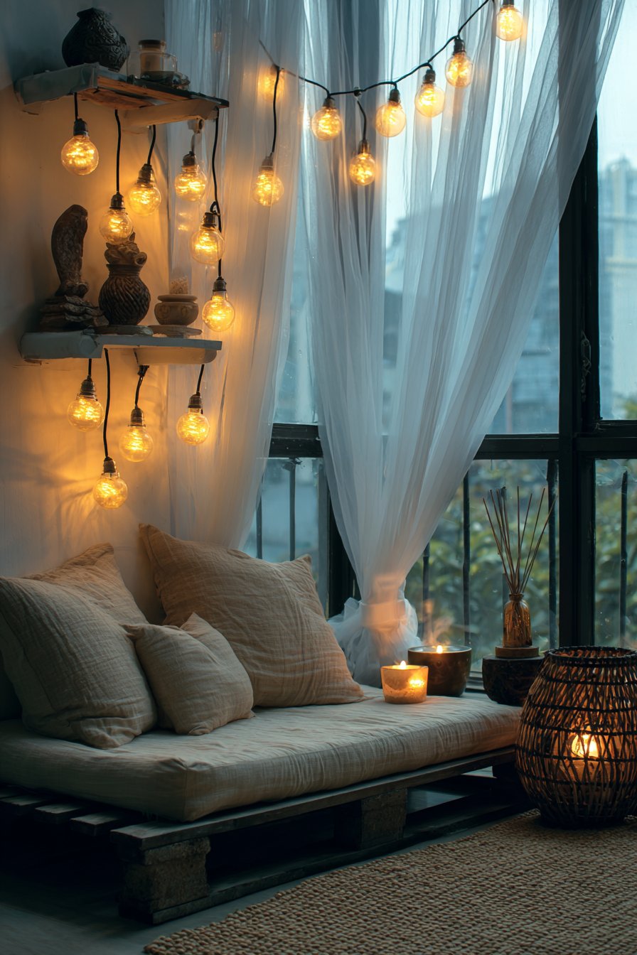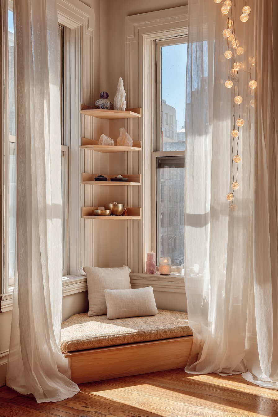 String lights with warm Edison bulbs drape along the corner walls, creating ambient lighting that can replace harsher overhead fixtures during meditation sessions. Sheer white curtains filter natural light, softening its intensity while maintaining connection to the outside world and the natural rhythm of daylight. A small essential oil diffuser releases gentle mist infused with lavender, sandalwood, or other calming scents, engaging multiple senses to deepen the meditative experience.