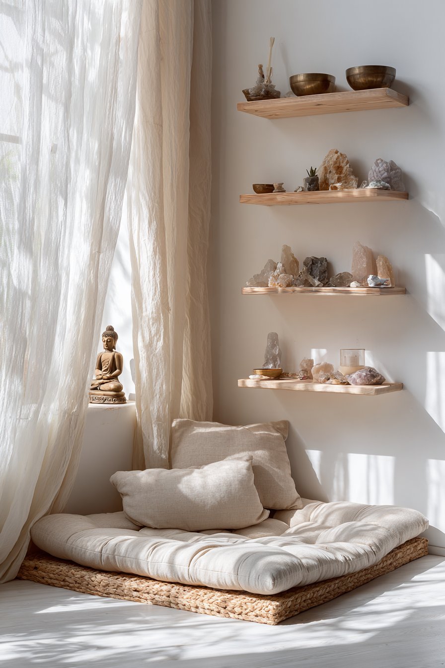 Floating corner shelves in light ash wood display meditation accessories with intention and care. Singing bowls in various sizes rest on small cushions, ready to fill the space with resonant tones. Crystals chosen for their purported healing properties catch and refract light in mesmerizing ways. A small Buddha statue or other spiritual iconography provides a focal point for contemplation. These items aren’t merely decorative—they’re tools for practice, arranged accessibly yet reverently.