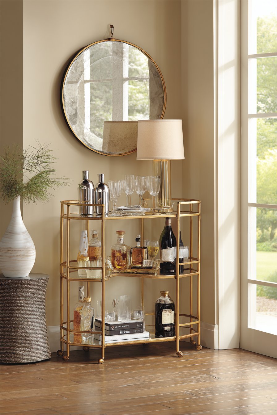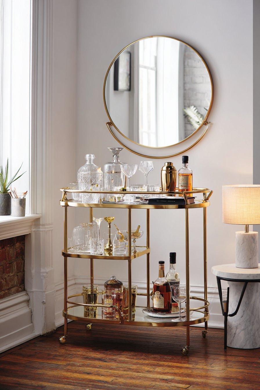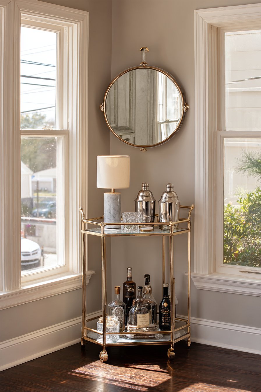 A corner bar cart station featuring room corner decor ideas elevates entertaining capabilities while adding sophisticated style to living spaces. The three-tier gold-finished bar cart positioned diagonally in the corner creates dynamic visual interest through its angled placement, which also makes both sides accessible and maximizes the corner’s spatial potential. The gold finish adds glamorous warmth, catching and reflecting light from multiple angles throughout the day and evening.