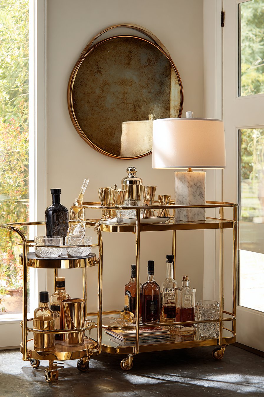 Key Design Tips: Stock your bar cart with versatile spirits that can make multiple cocktails rather than obscure bottles used once yearly. Keep fresh garnishes like lemons, limes, and herbs in your kitchen, bringing them out when entertaining. Polish glassware and metallic surfaces regularly to maintain sparkle and appeal. Rotate displayed bottles seasonally to reflect changing cocktail preferences—lighter spirits in summer, darker options in winter. Use the bottom tier for heavy items to maintain the cart’s stability and prevent tipping.