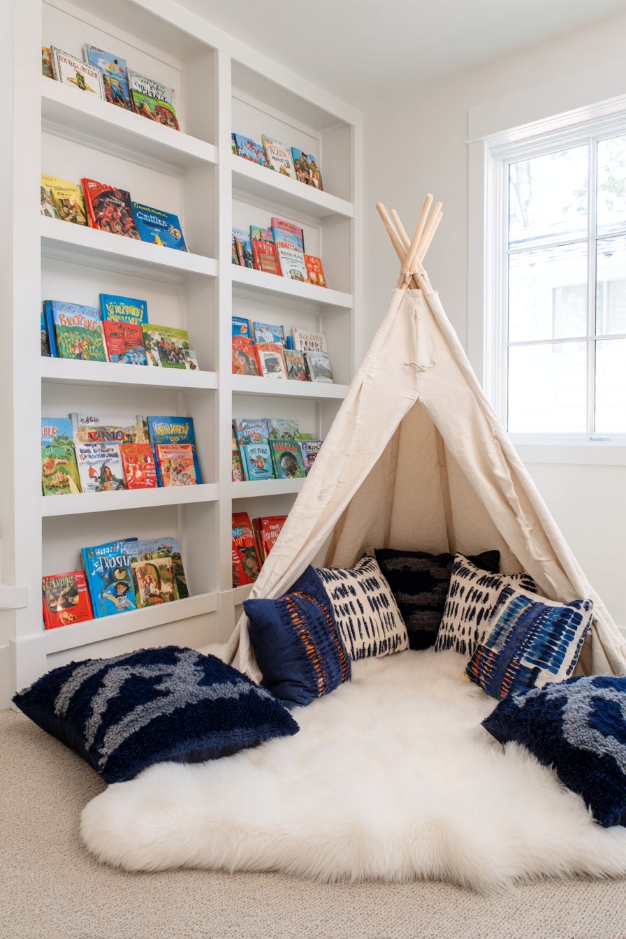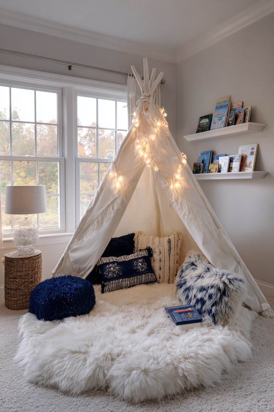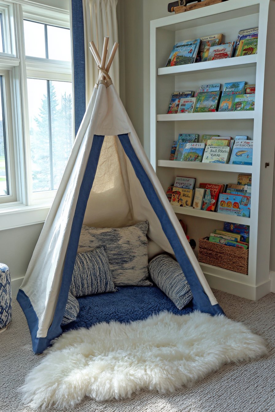 Key Design Tips: Choose washable fabrics for all cushions and rugs to manage inevitable spills and accidents. Ensure the teepee is stable and won’t collapse if a child leans against it—secure it to the wall if necessary. Rotate books regularly to maintain interest and support developing reading skills. Keep the space clutter-free with only a manageable number of books displayed—use the rotation to introduce variety without overwhelming choice. Position the corner near a window for natural daylight reading but away from direct sun that could cause glare on book pages or fade fabrics.