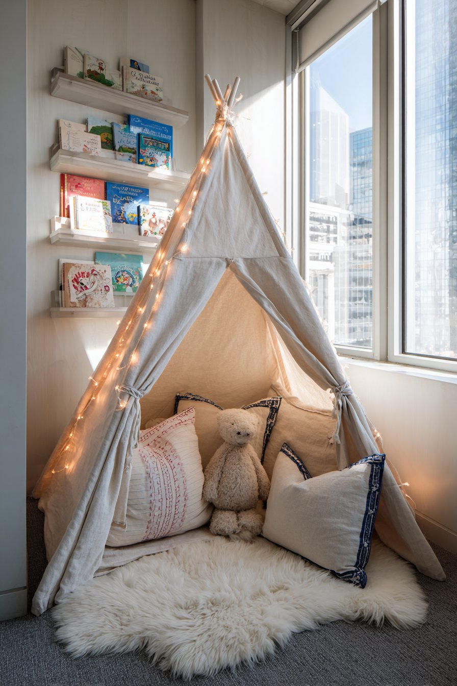 A children’s reading nook corner implementing room corner decor ideas creates a magical retreat that encourages literacy and imagination while providing a dedicated personal space within shared rooms. The teepee tent in natural canvas with navy trim tucked into the corner transforms ordinary architecture into an adventure destination. Children are naturally drawn to enclosed spaces that feel protective and private, and the teepee satisfies this developmental need while remaining open enough for parental supervision.